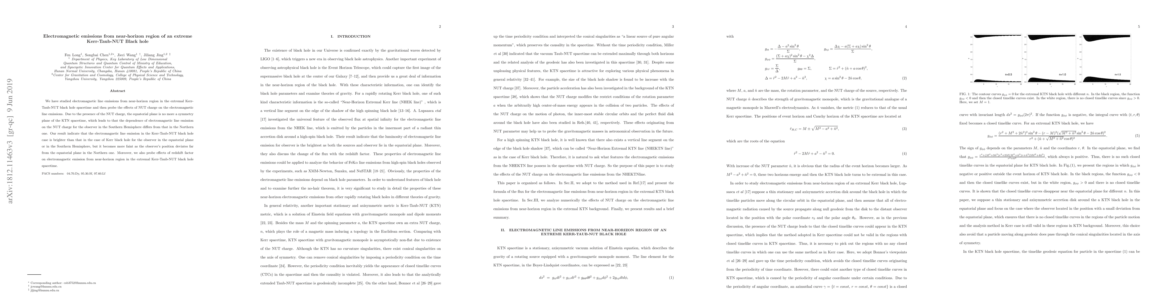 This research investigates electromagnetic line emissions from the near-horizon region of an extremal Kerr-Taub-NUT black hole, highlighting that the NUT charge affects emission differently in the Southern and Northern Hemispheres. Emissions are brighter in the Southern Hemisphere and equatorial plane compared to the Kerr black hole, but fade further from the equatorial plane in the Northern Hemisphere. Additionally, redshift factors impact these near-horizon emissions.