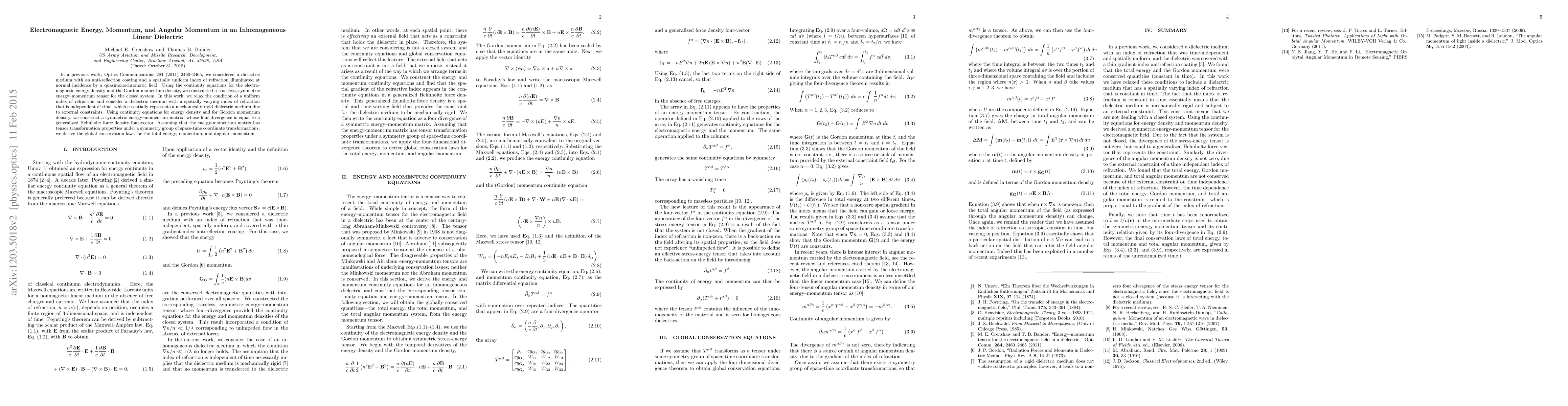 The derivation of a symmetric energy-momentum matrix and global conservation laws for an inhomogeneous dielectric medium, accounting for a spatially varying index of refraction.