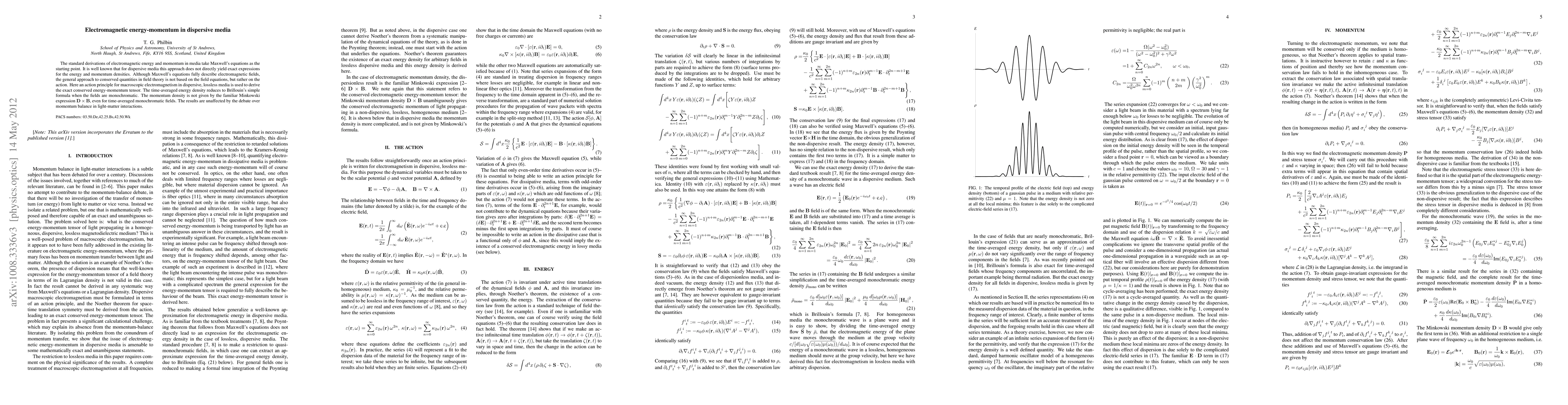 This paper derives an exact energy-momentum tensor for electromagnetic fields in dispersive media using an action principle, showing that the time-averaged energy density aligns with Brillouin's formula for monochromatic fields, while the momentum density differs from the standard Minkowski expression.