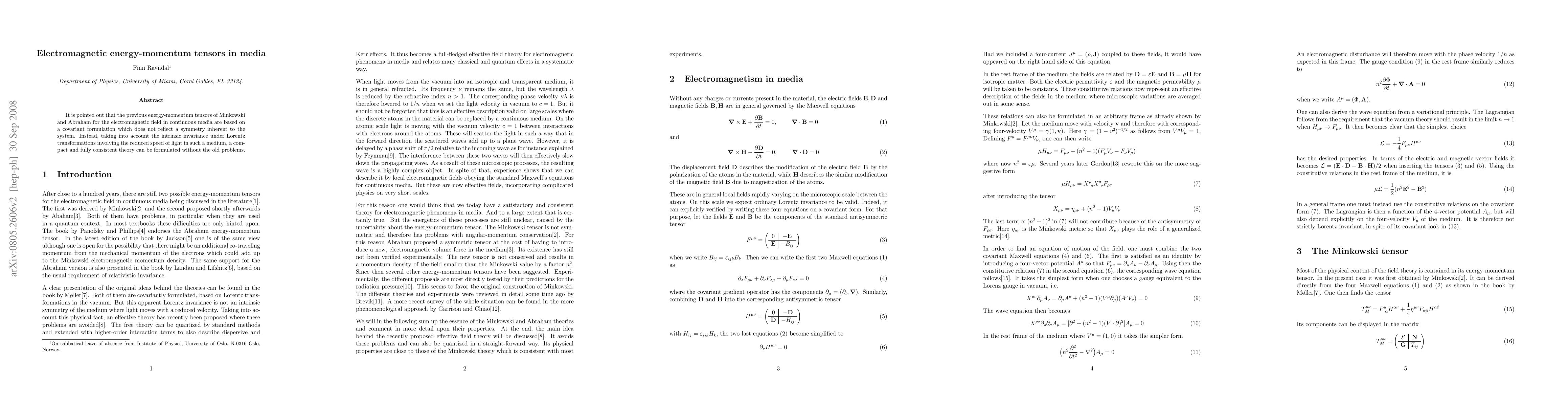 This paper proposes a new electromagnetic energy-momentum tensor for continuous media that corrects previous formulations by incorporating intrinsic invariance under Lorentz transformations, thus providing a more symmetric and consistent theory. The new tensor resolves issues present in earlier models based on the reduced speed of light in the medium.