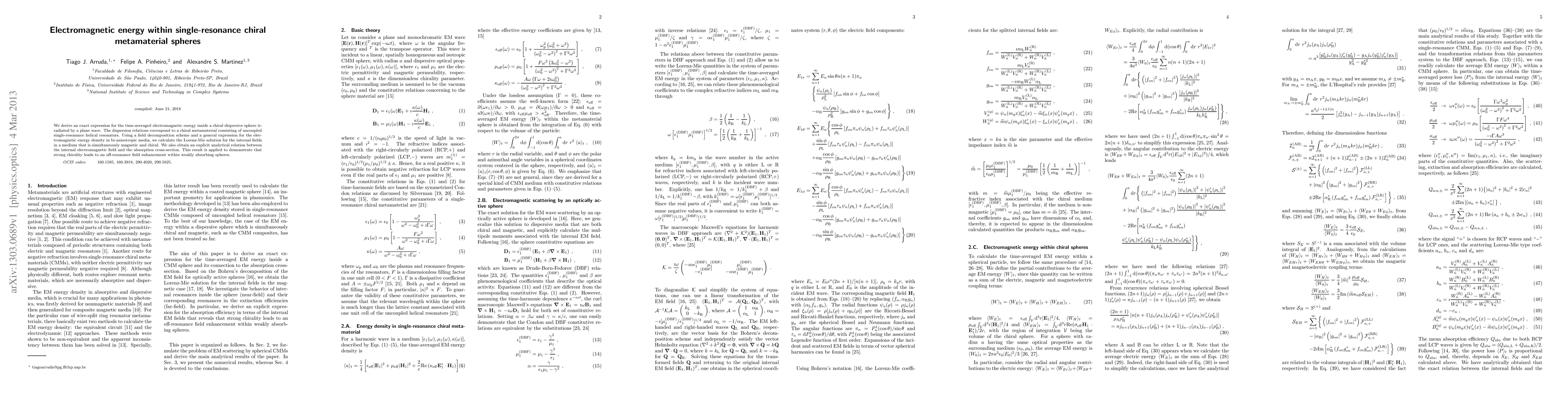 This paper derives an exact expression for the time-averaged electromagnetic energy inside a chiral metamaterial sphere, revealing an off-resonance field enhancement due to strong chirality, despite weak absorption. The analysis employs a field decomposition scheme and the Lorenz-Mie solution for internal fields in magnetic and chiral media.