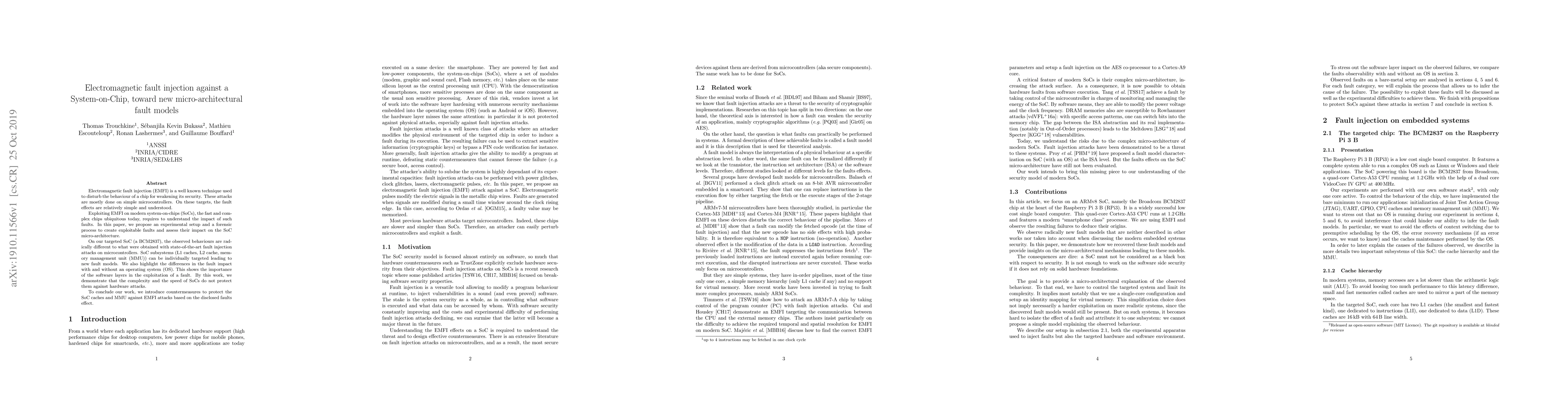This paper explores electromagnetic fault injection (EMFI) on modern System-on-Chips (SoCs), revealing new micro-architectural fault models and demonstrating that SoCs are not immune to such attacks. The study proposes an experimental setup to create and analyze exploitable faults, showing significant differences in fault impact compared to microcontrollers, and introduces countermeasures to protect SoC components like caches and MMU.