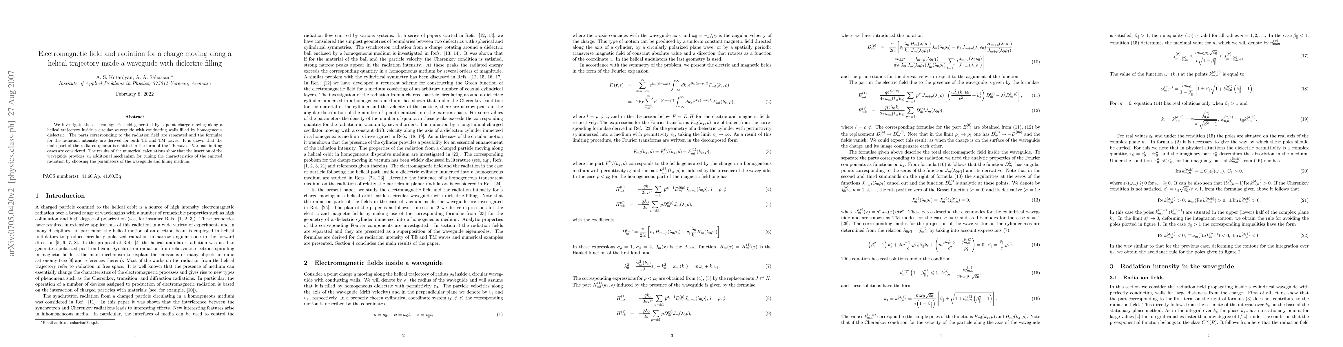 This paper investigates electromagnetic fields from a helically moving charge within a dielectric-filled circular waveguide. It derives radiation intensity formulas for TE and TM waves, showing that TE waves dominate, and explores how waveguide parameters affect radiation characteristics.