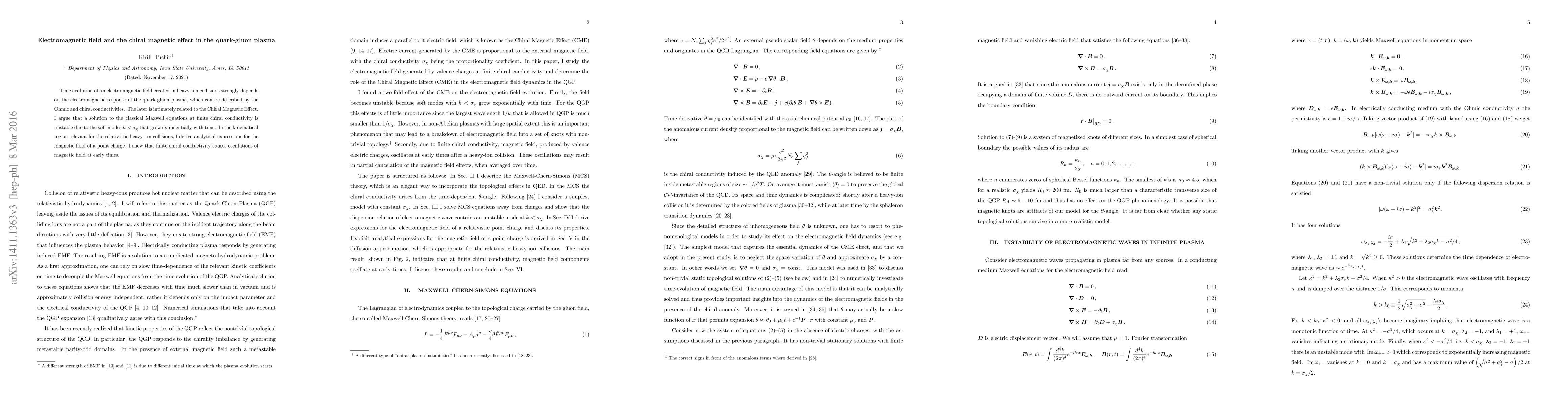 Time evolution of electromagnetic field created in heavy-ion collisions strongly depends on the electromagnetic response of the quark-gluon plasma, which can be described by the Ohmic and chiral conductivities. The later is intimately related to the Chiral Magnetic Effect. I argue that a solution to the classical Maxwell equations at finite chiral conductivity is unstable due to the soft modes $k<\sigma_\chi$ that grow exponentially with time. In the kinematical region relevant for the relativistic heavy-ion collisions, I derive analytical expressions for the magnetic field of a point charge. I show that finite chiral conductivity causes oscillations of magnetic field at early times.