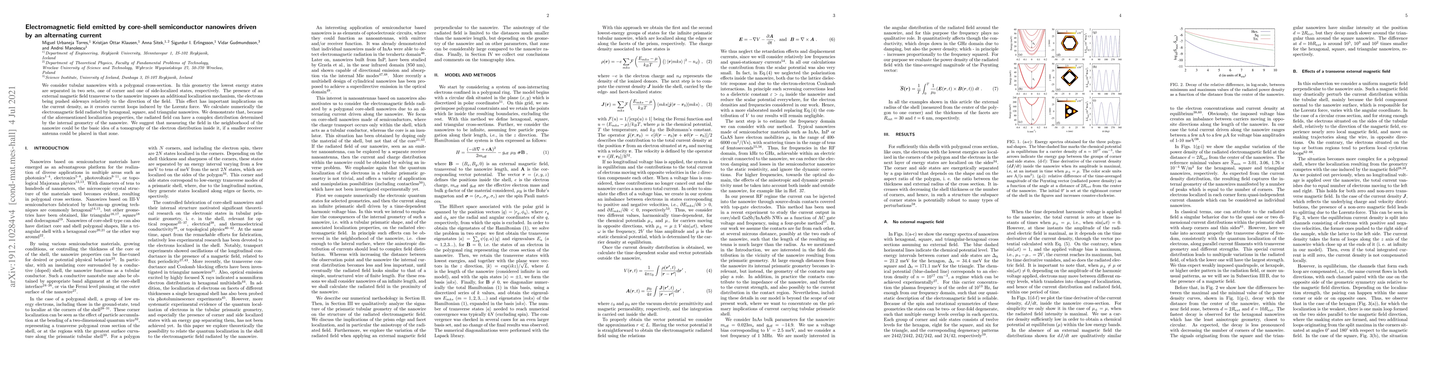 We consider tubular nanowires with a polygonal cross-section. In this geometry the lowest energy states are separated in two sets, one of corner and one of side-localized states, respectively. The presence of an external magnetic field transverse to the nanowire imposes an additional localization mechanism, the electrons being pushed sideways relatively to the direction of the field. This effect has important implications on the current density, as it creates current loops induced by the Lorentz force. We calculate numerically the electromagnetic field radiated by hexagonal, square, and triangular nanowires. We demonstrate that, because of the aforementioned localization properties, the radiated field can have a complex distribution determined by the internal geometry of the nanowire. We suggest that measuring the field in the neighborhood of the nanowire could be the basic idea of a tomography of the electron distribution inside it, if a smaller receiver antenna could be placed in that zone.