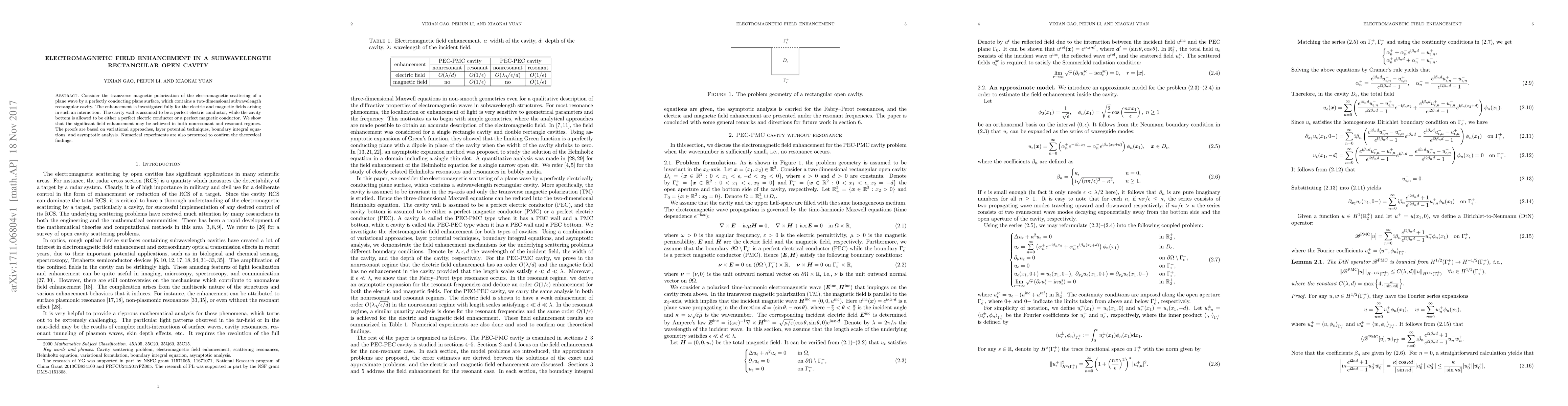 This paper investigates electromagnetic field enhancement in a subwavelength rectangular open cavity within a perfectly conducting plane, employing variational methods and numerical experiments to demonstrate significant field enhancement in both nonresonant and resonant conditions. Theoretical proofs and numerical results confirm the effectiveness of the cavity design.