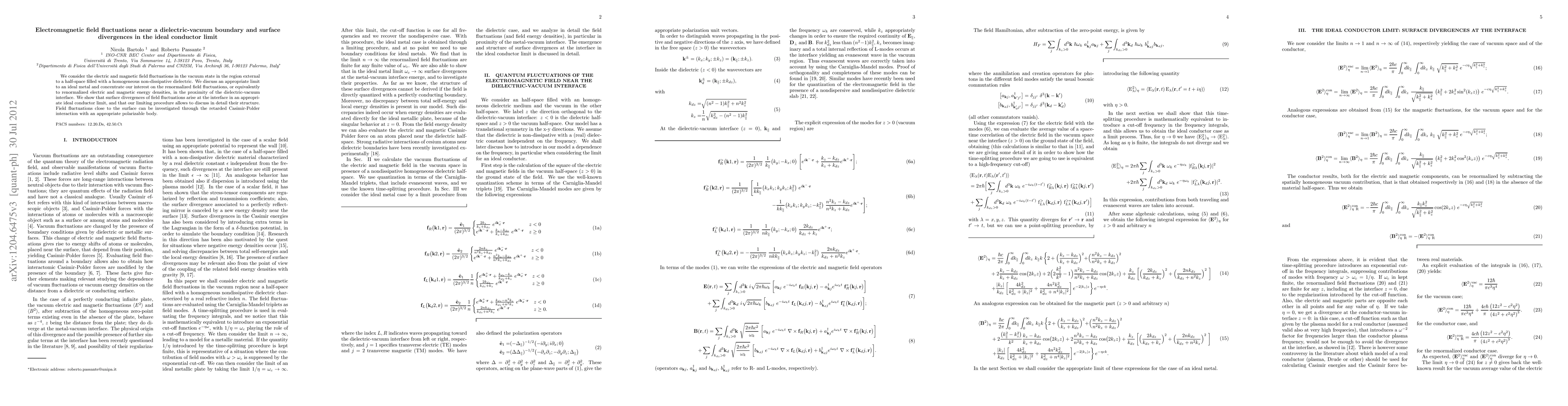This paper investigates electromagnetic field fluctuations near a dielectric-vacuum boundary, focusing on renormalized field fluctuations and energy densities. It reveals surface divergences of field fluctuations in the ideal conductor limit, providing a detailed analysis of their structure via the retarded Casimir-Polder interaction.