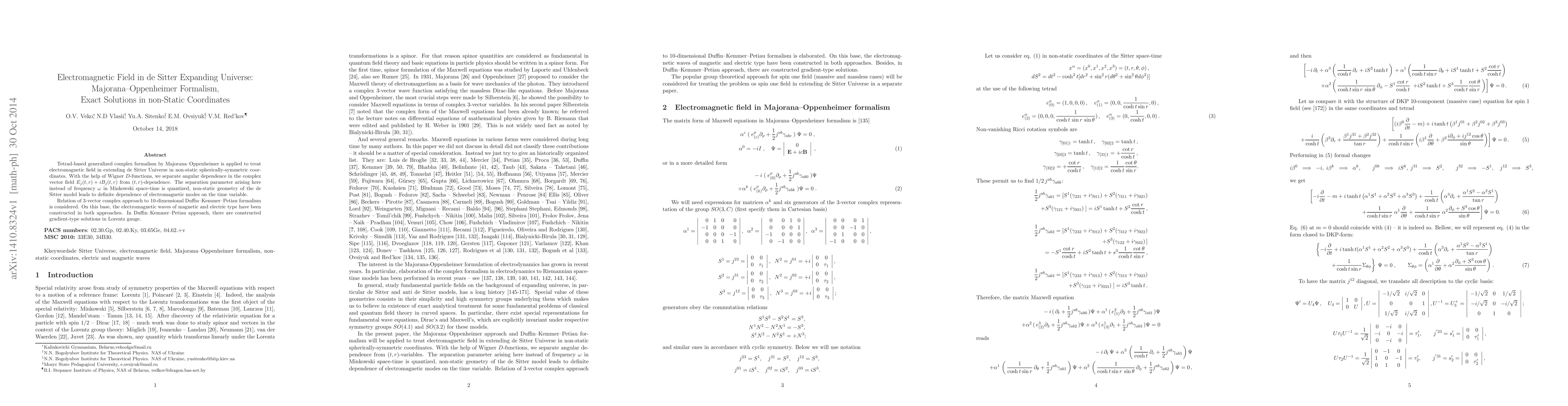 Tetrad-based generalized complex formalism by Majorana--Oppenheimer is applied to treat electromagnetic field in extending de Sitter Universe in on-static spherically-symmetric coordinates. With the help of Wigner D-functions, we separate angular dependence in the complex vector field E_{j}(t,r)+i B_{j}(t,r) from (t,r)-dependence. The separation parameter arising here instead of frequency \omega in Minkowski space-time is quantized, non-static geometry of the de Sitter model leads to definite dependence of electromagnetic modes on the time variable. Relation of 3-vector complex approach to 10-dimensional Duffin-Kemmer-Petiau formalism is considered. On this base, the electromagnetic waves of magnetic and electric type have been constructed in both approaches. In Duffin-Kemmer-Petiau approach, there are constructed gradient-type solutions in Lorentz gauge.