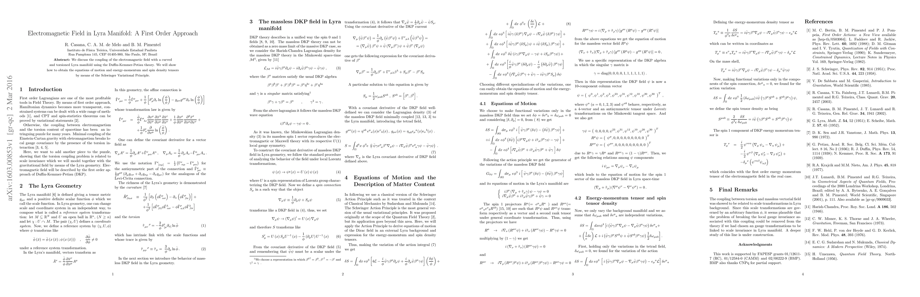 We discuss the coupling of the electromagnetic field with a curved and torsioned Lyra manifold using the Duffin-Kemmer-Petiau theory. We will show how to obtain the equations of motion and energy-momentum and spin density tensors by means of the Schwinger Variational Principle.