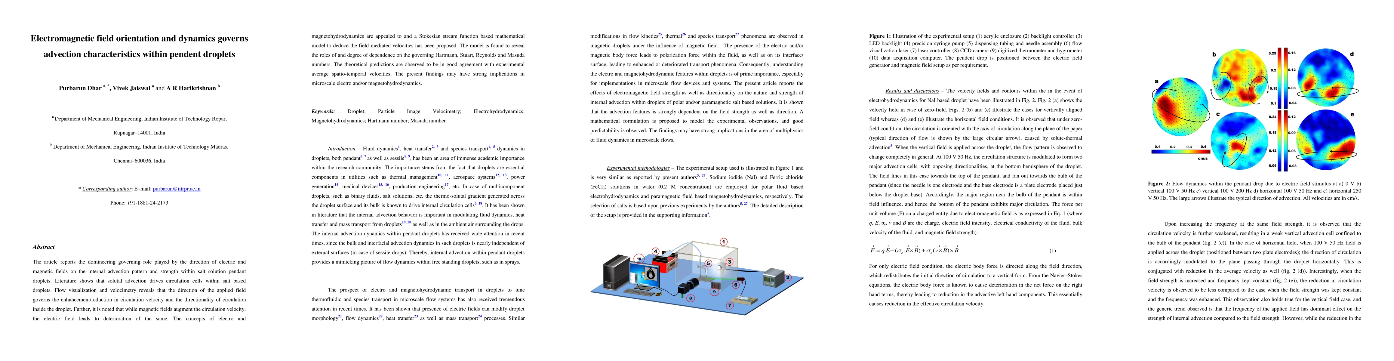 This paper investigates how electric and magnetic fields influence the advection dynamics within salt solution pendant droplets, revealing that field orientation dictates the circulation pattern and velocity. The study proposes a mathematical model based on electro and magnetohydrodynamics, showing good agreement with experimental observations and highlighting the significance of Hartmann, Stuart, Reynolds, and Masuda numbers.