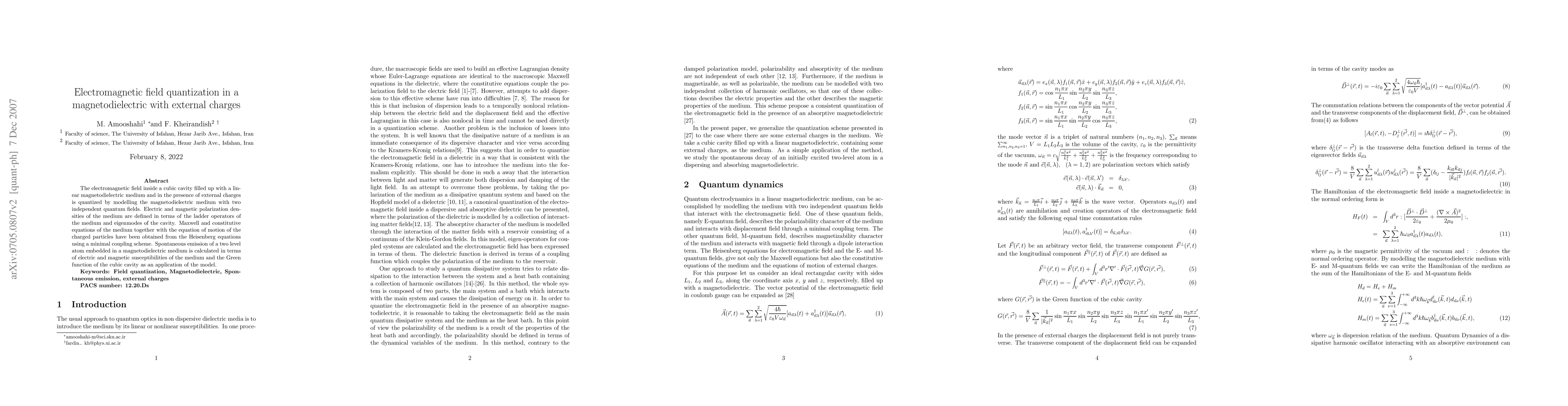 This paper quantizes the electromagnetic field in a magnetodielectric medium within a cubic cavity, using two independent quantum fields to model the medium. It derives Maxwell and constitutive equations from Heisenberg equations and calculates spontaneous emission of an embedded atom using the medium's susceptibilities and cavity's Green function.