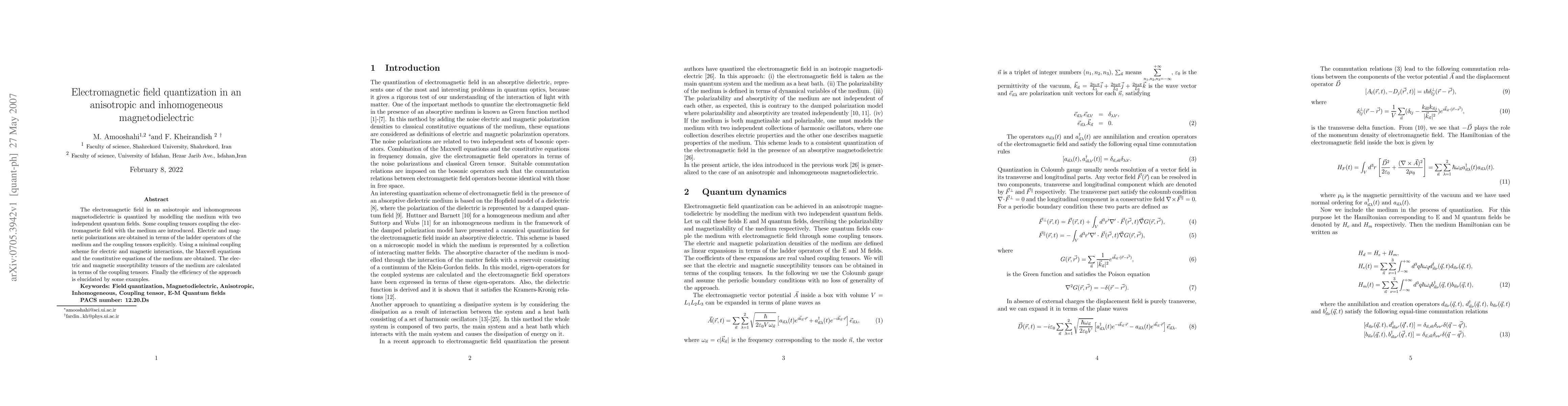 This paper quantizes the electromagnetic field in anisotropic and inhomogeneous magnetodielectrics by employing two independent quantum fields and coupling tensors. It derives electric and magnetic polarizations using ladder operators and minimal coupling, and calculates susceptibility tensors, demonstrating the method's efficiency through examples.