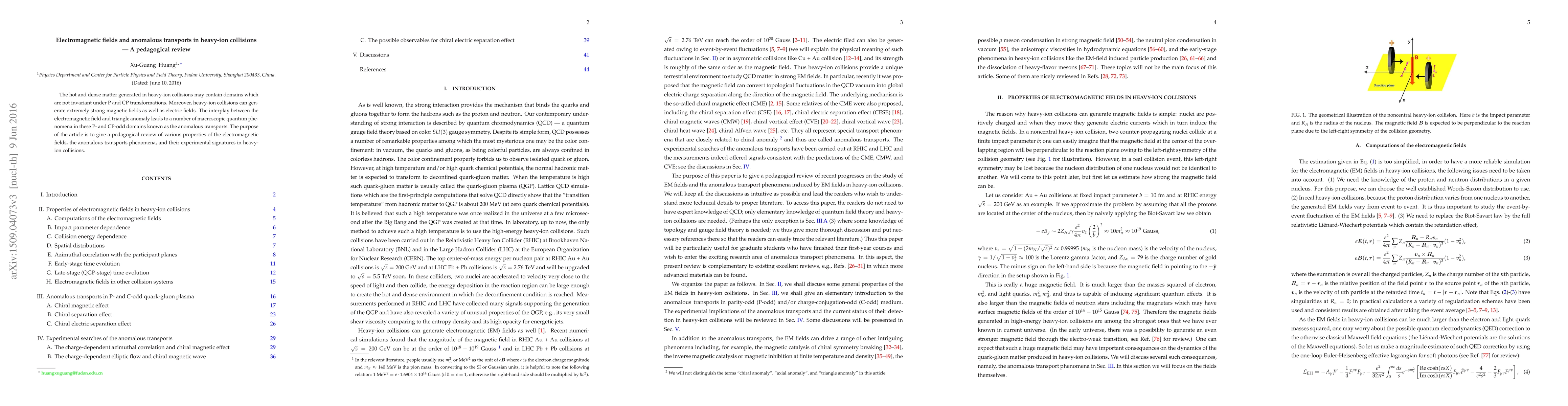The hot and dense matter generated in heavy-ion collisions may contain domains which are not invariant under P and CP transformations. Moreover, heavy-ion collisions can generate extremely strong magnetic fields as well as electric fields. The interplay between the electromagnetic field and triangle anomaly leads to a number of macroscopic quantum phenomena in these P- and CP-odd domains known as the anomalous transports. The purpose of the article is to give a pedagogical review of various properties of the electromagnetic fields, the anomalous transports phenomena, and their experimental signatures in heavy-ion collisions.