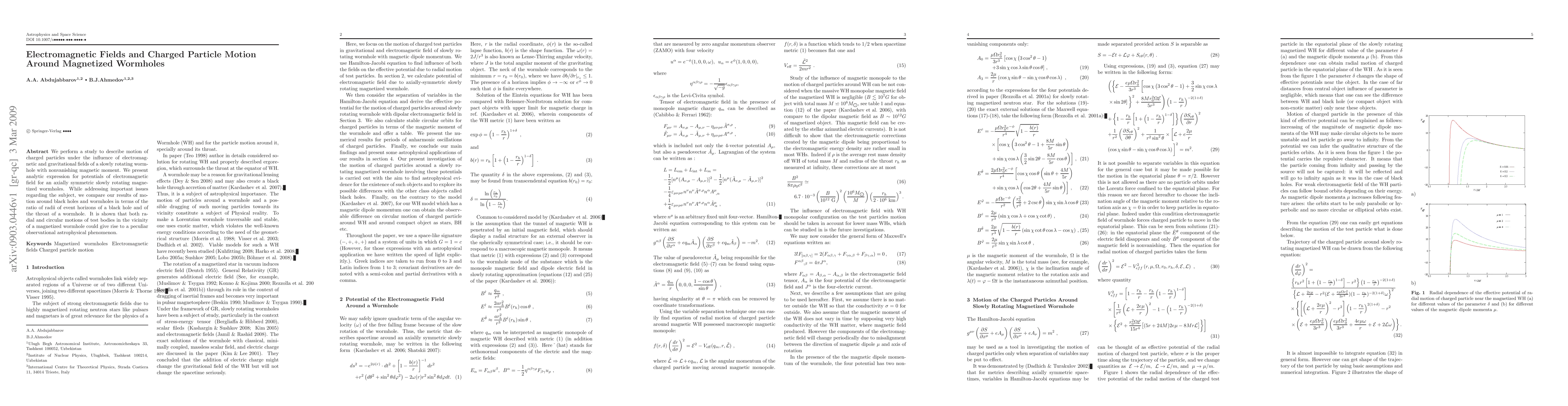 This paper investigates the motion of charged particles near a slowly rotating magnetized wormhole, deriving analytic expressions for its electromagnetic field potentials. It compares the motion around wormholes and black holes, revealing unique observational phenomena due to the wormhole's magnetic moment.