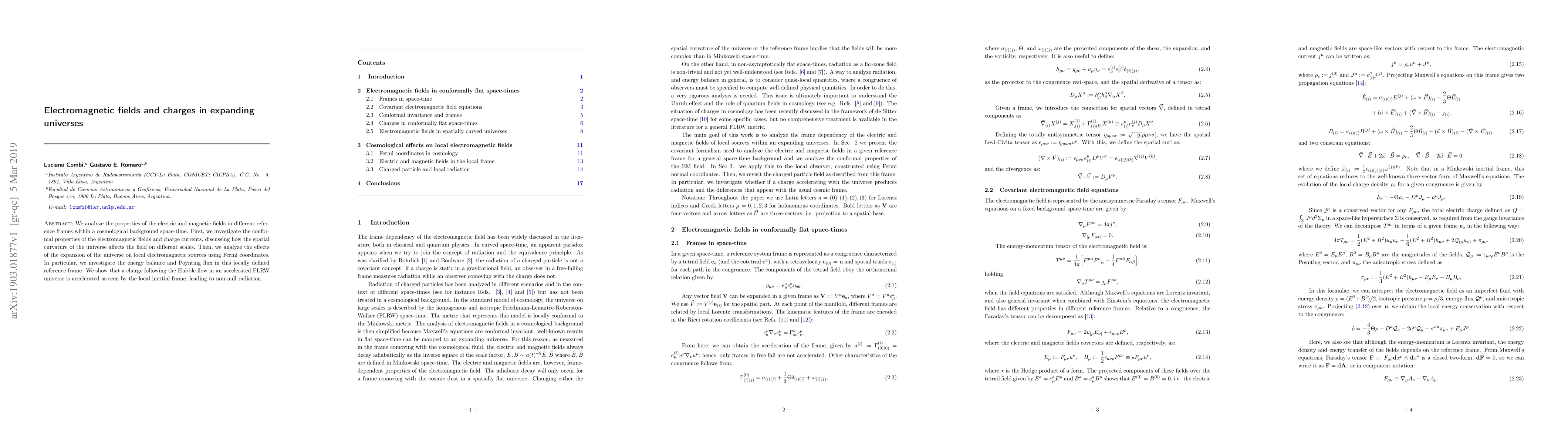 We analyze the properties of the electric and magnetic fields in different reference frames within a cosmological background space-time. First, we investigate the conformal properties of the electromagnetic fields and charge currents, discussing how the spatial curvature of the universe affects the field on different scales. Then, we analyze the effects of the expansion of the universe on local electromagnetic sources using Fermi coordinates. In particular, we investigate the energy balance and Poynting flux in this locally defined reference frame. We show that a charge following the Hubble flow in an accelerated FLRW universe is accelerated as seen by the local inertial frame, leading to non-null radiation.
