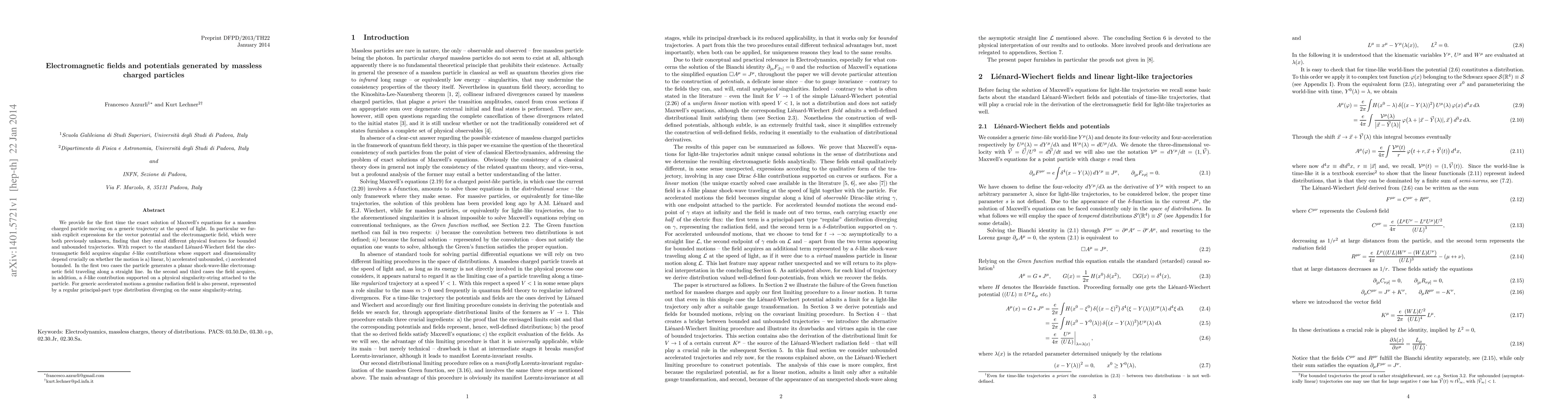 We provide for the first time the exact solution of Maxwell's equations for a massless charged particle moving on a generic trajectory at the speed of light. In particular we furnish explicit expressions for the vector potential and the electromagnetic field, which were both previously unknown, finding that they entail different physical features for bounded and unbounded trajectories. With respect to the standard Lienard-Wiechert field the electromagnetic field acquires singular delta-like contributions whose support and dimensionality depend crucially on whether the motion is a) linear, b) accelerated unbounded, c) accelerated bounded. In the first two cases the particle generates a planar shock-wave-like electromagnetic field traveling along a straight line. In the second and third cases the field acquires, in addition, a delta-like contribution supported on a physical singularity-string attached to the particle. For generic accelerated motions a genuine radiation field is also present, represented by a regular principal-part type distribution diverging on the same singularity-string.
