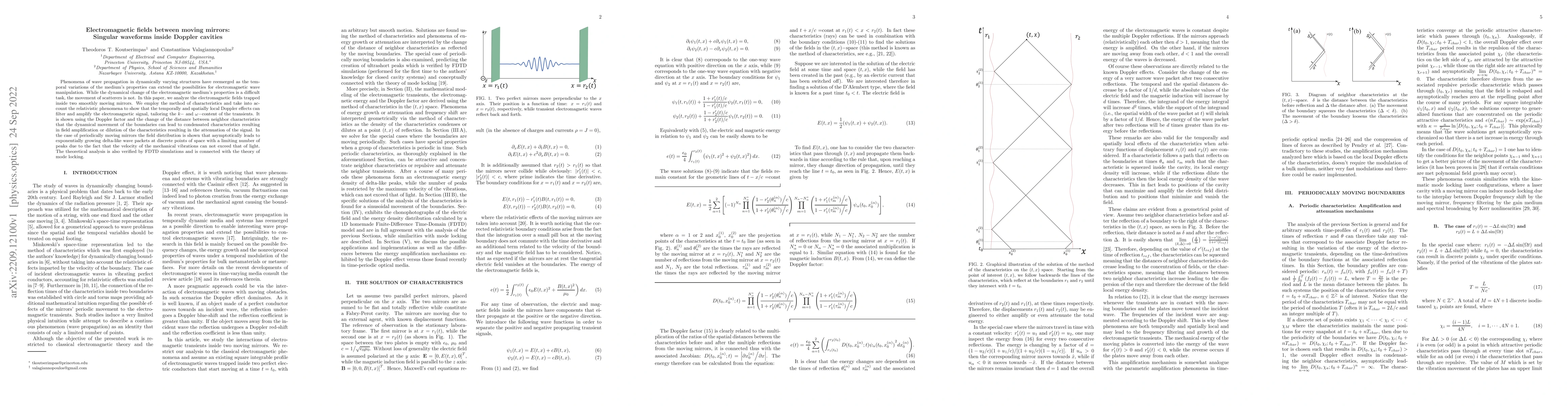 Phenomena of wave propagation in dynamically varying structures have reemerged as the temporal variations of the medium's properties can extend the possibilities for electromagnetic wave manipulation. While the dynamical change of the electromagnetic medium's properties is a difficult task, the movement of scatterers is not. In this paper, we analyze the electromagnetic fields trapped inside two smoothly moving mirrors. We employ the method of characteristics and take into account the relativistic phenomena to show that the temporally and spatially local Doppler effects can filter and amplify the electromagnetic signal, tailoring the $k-$ and $\omega-$content of the transients. It is shown using the Doppler factor and the change of the distance between neighbor characteristics that the dynamical movement of the boundaries can lead to condensated characteristics resulting in field amplification or dilution of the characteristics resulting in the attenuation of the signal. In the case of periodically moving mirrors the field distribution is shown that asymptotically leads to exponentially growing delta-like wave packets at discrete points of space with a limiting number of peaks due to the fact that the velocity of the mechanical vibrations can not exceed that of light. The theoretical analysis is also verified by FDTD simulations and is connected with the theory of mode locking.
