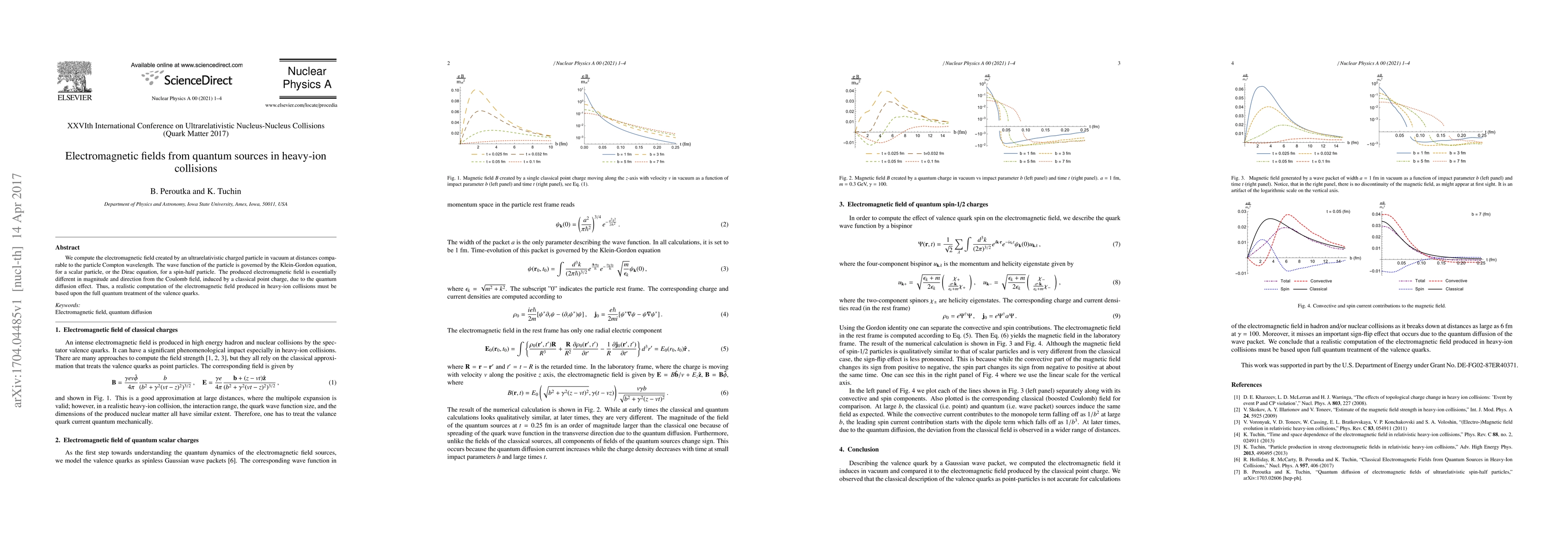 We compute the electromagnetic field created by an ultrarelativistic charged particle in vacuum at distances comparable to the particle Compton wavelength. The wave function of the particle is governed by the Klein-Gordon equation, for a scalar particle, or the Dirac equation, for a spin-half particle. The produced electromagnetic field is essentially different in magnitude and direction from the Coulomb field, induced by a classical point charge, due to the quantum diffusion effect. Thus, a realistic computation of the electromagnetic field produced in heavy-ion collisions must be based upon the full quantum treatment of the valence quarks.