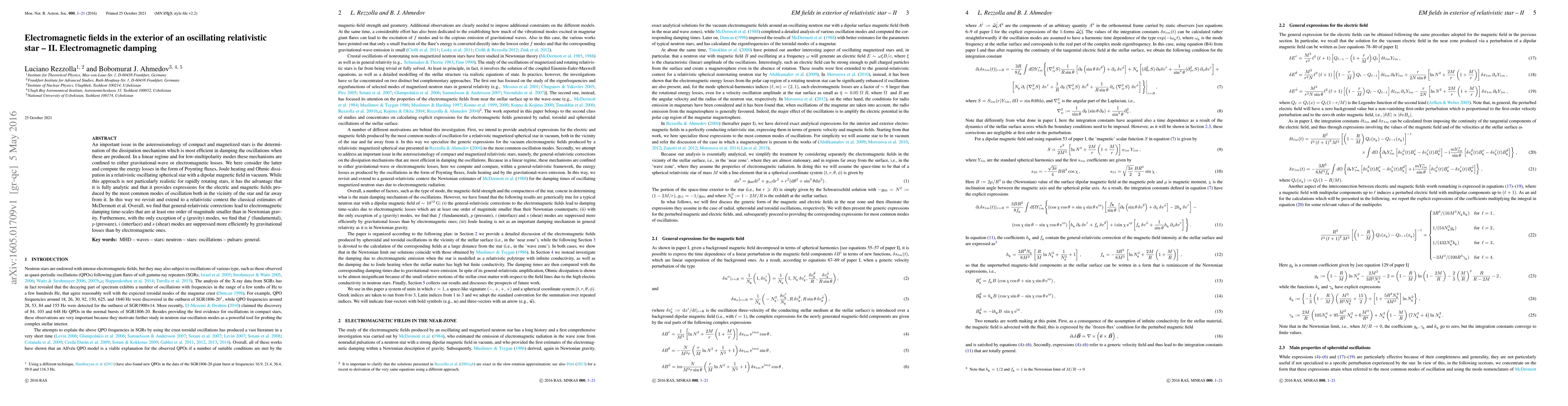 An important issue in the asteroseismology of compact and magnetized stars is the determination of the dissipation mechanism which is most efficient in damping the oscillations when these are produced. In a linear regime and for low-multipolarity modes these mechanisms are confined to either gravitational-wave or electromagnetic losses. We here consider the latter and compute the energy losses in the form of Poynting fluxes, Joule heating and Ohmic dissipation in a relativistic oscillating spherical star with a dipolar magnetic field in vacuum. While this approach is not particularly realistic for rapidly rotating stars, it has the advantage that it is fully analytic and that it provides expressions for the electric and magnetic fields produced by the most common modes of oscillation both in the vicinity of the star and far away from it. In this way we revisit and extend to a relativistic context the classical estimates of McDermott et al. Overall, we find that general-relativistic corrections lead to electromagnetic damping time-scales that are at least one order of magnitude smaller than in Newtonian gravity. Furthermore, with the only exception of $g$ (gravity) modes, we find that $f$ (fundamental), $p$ (pressure), $i$ (interface) and $s$ (shear) modes are suppressed more efficiently by gravitational losses than by electromagnetic ones.