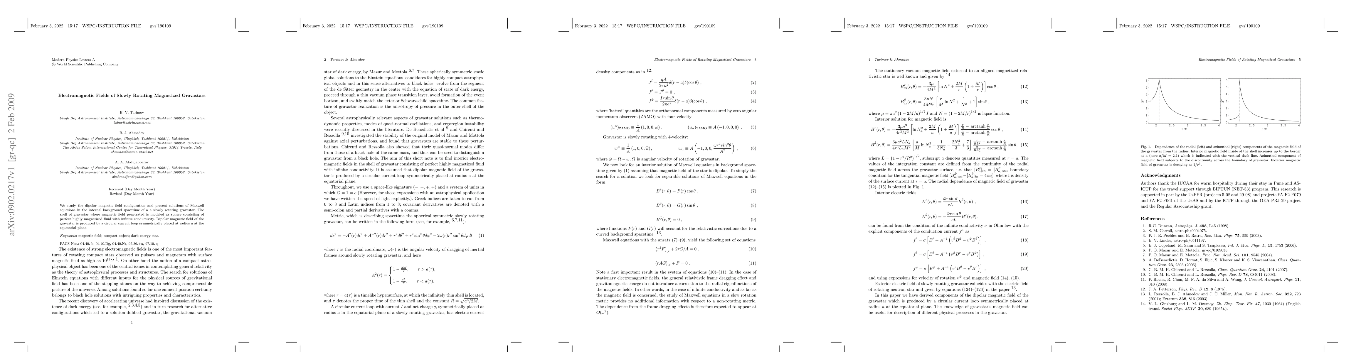 We study the dipolar magnetic field configuration and present solutions of Maxwell equations in the internal background spacetime of a a slowly rotating gravastar. The shell of gravastar where magnetic field penetrated is modeled as sphere consisting of perfect highly magnetized fluid with infinite conductivity. Dipolar magnetic field of the gravastar is produced by a circular current loop symmetrically placed at radius $a$ at the equatorial plane.