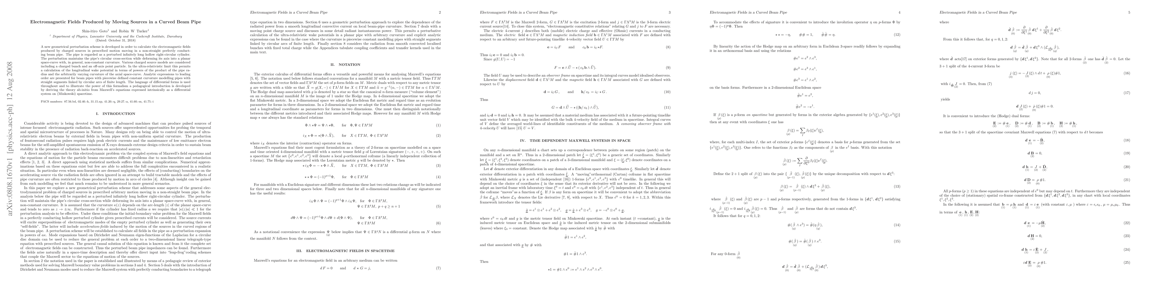 A new geometrical perturbation scheme is developed in order to calculate the electromagnetic fields produced by charged sources in prescribed motion moving in a non-straight perfectly conducting beam pipe. The pipe is regarded as a perturbed infinitely long hollow right-circular cylinder. The perturbation maintains the pipe's circular cross-section while deforming its axis into a planar space-curve with, in general, non-constant curvature. Various charged source models are considered including a charged bunch and an off-axis point particle. In the ultra-relativistic limit this permits a calculation of the longitudinal wake potential in terms of powers of the product of the pipe radius and the arbitrarily varying curvature of the axial space-curve. Analytic expressions to leading order are presented for beam pipes with piecewise defined constant curvature modelling pipes with straight segments linked by circular arcs of finite length. The language of differential forms is used throughout and to illustrate the power of this formalism a pedagogical introduction is developed by deriving the theory ab-initio from Maxwell's equations expressed intrinsically as a differential system on (Minkowski) spacetime.