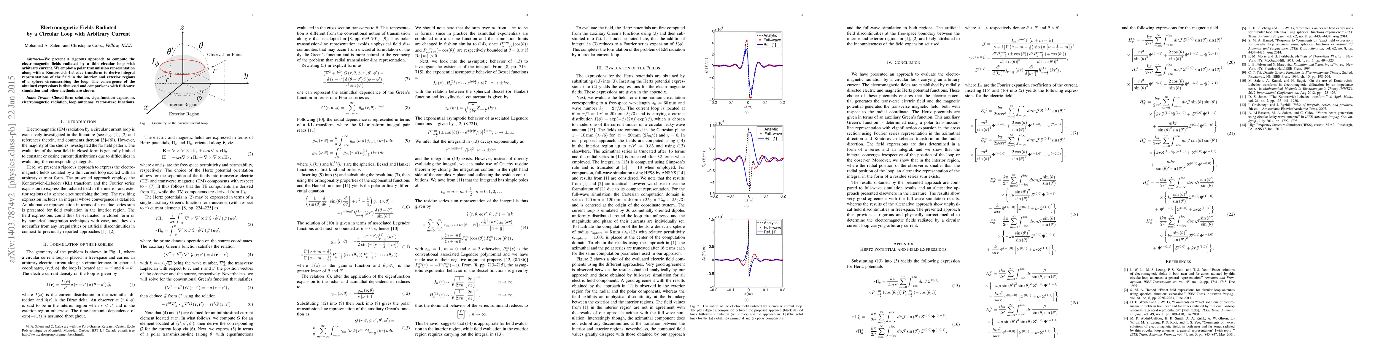 Researchers developed a method to calculate electromagnetic fields radiated by a circular loop with arbitrary current, comparing it favorably to full-wave simulations and other methods.