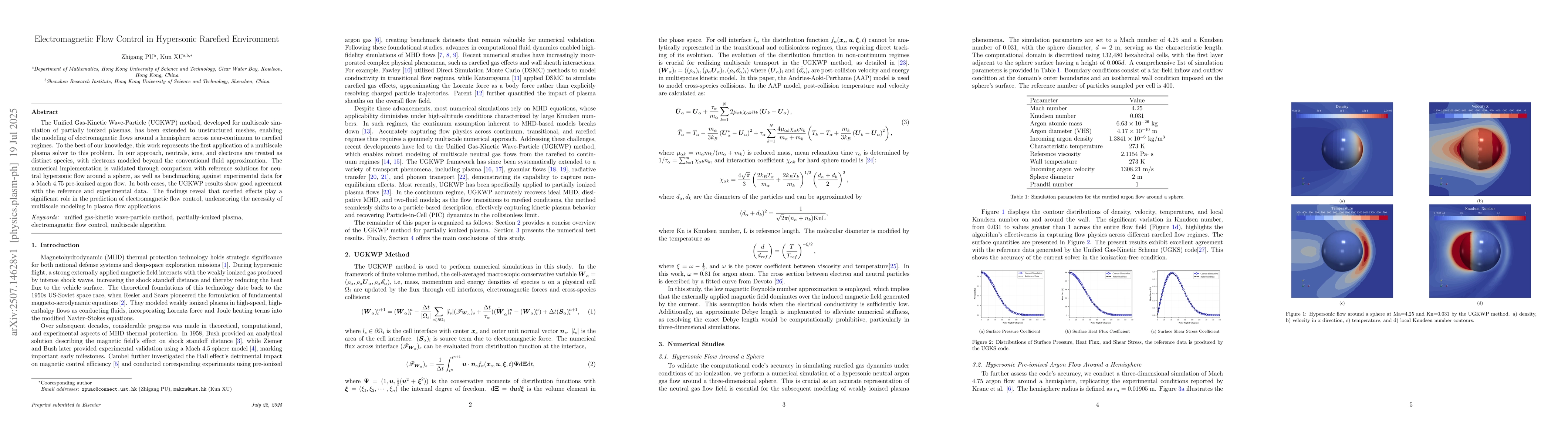 The Unified Gas-Kinetic Wave-Particle (UGKWP) method, developed for multiscale simulation of partially ionized plasmas, has been extended to unstructured meshes, enabling the modeling of electromagnetic flows around a hemisphere across near-continuum to rarefied regimes. To the best of our knowledge, this work represents the first application of a multiscale plasma solver to this problem. In our approach, neutrals, ions, and electrons are treated as distinct species, with electrons modeled beyond the conventional fluid approximation. The numerical implementation is validated through comparison with reference solutions for neutral hypersonic flow around a sphere, as well as benchmarking against experimental data for a Mach 4.75 pre-ionized argon flow. In both cases, the UGKWP results show good agreement with the reference and experimental data. The findings reveal that rarefied effects play a significant role in the prediction of electromagnetic flow control, underscoring the necessity of multiscale modeling in plasma flow applications.