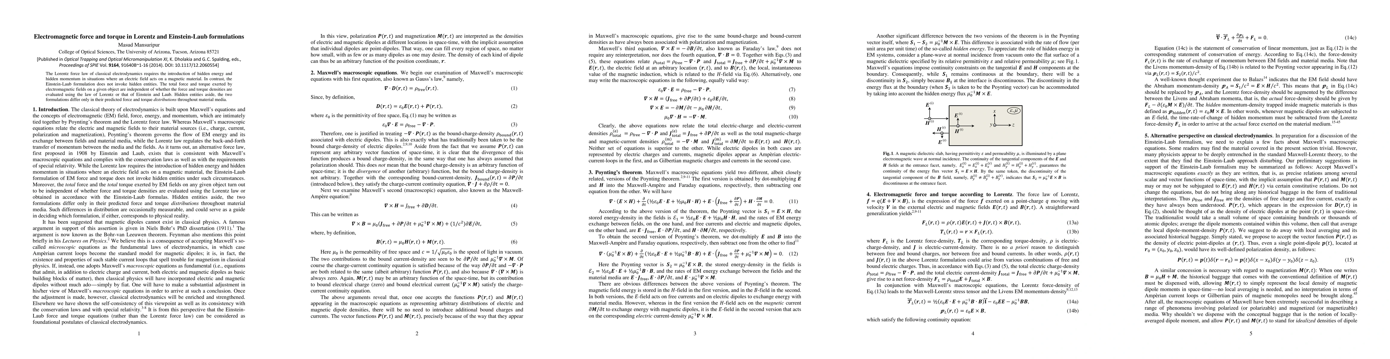 This paper compares electromagnetic force and torque in the Lorentz and Einstein-Laub formulations, revealing that while both yield the same total force and torque, the Einstein-Laub approach avoids hidden energy and momentum, differing only in the distribution of forces within magnetic materials.