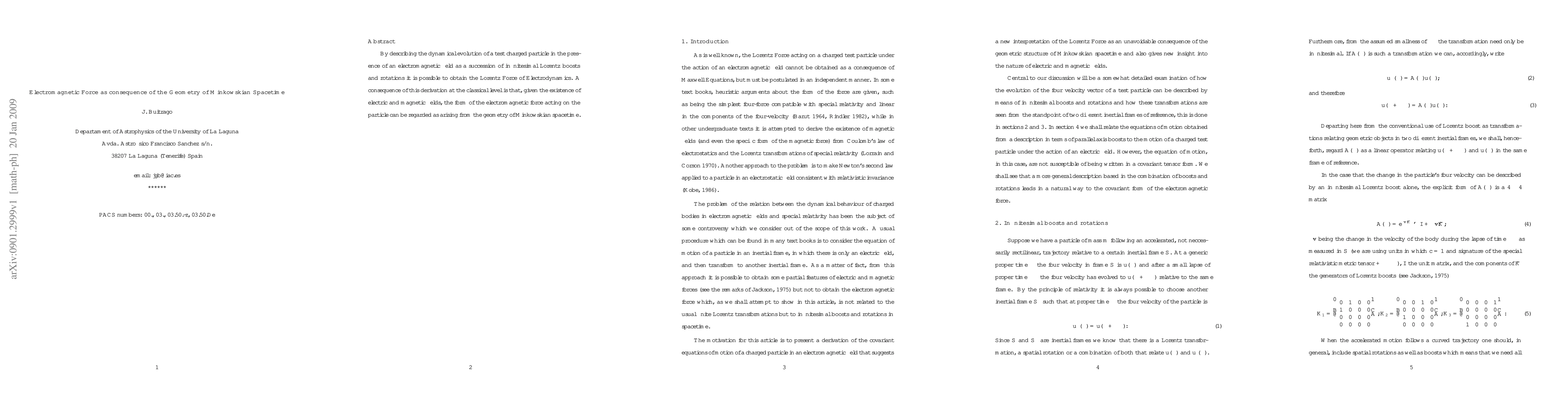 This paper derives the Lorentz Force from the dynamics of a charged particle in electromagnetic fields, showing that the electromagnetic force emerges from the geometric structure of Minkowskian spacetime through Lorentz boosts and rotations. This classical derivation links electrodynamics to the underlying spacetime geometry.
