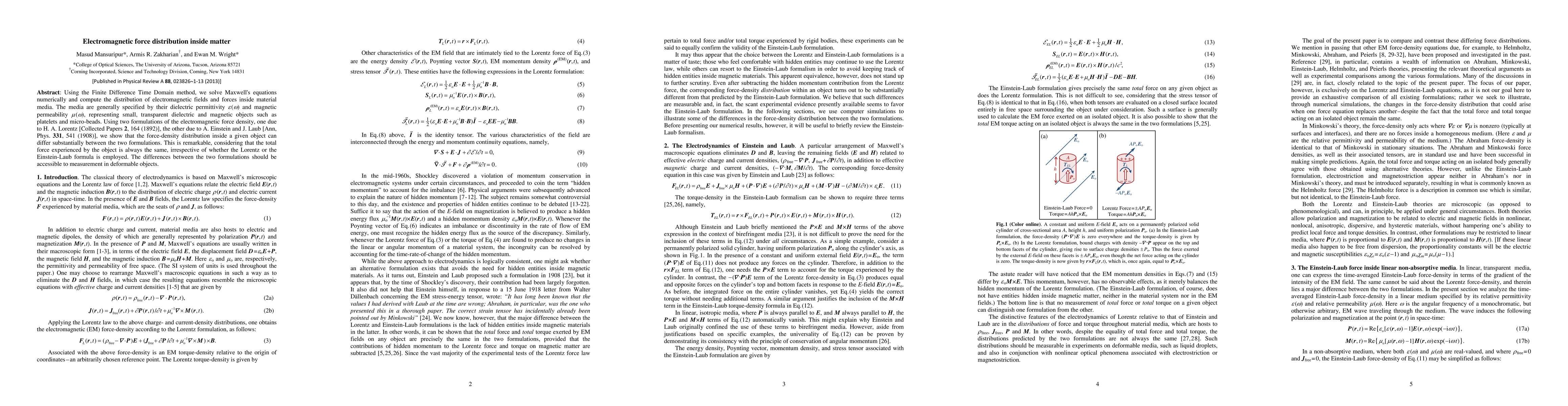 Using the Finite Difference Time Domain method, we solve Maxwell's equations numerically and compute the distribution of electromagnetic fields and forces inside material media. The media are generally specified by their dielectric permittivity epsilon(w) and magnetic permeability mu(w), representing small, transparent dielectric and magnetic objects such as platelets and micro-beads. Using two formulations of the electromagnetic force-density, one due to H. A. Lorentz [Collected Papers 2, 164 (1892)], the other due to A. Einstein and J. Laub [Ann, Phys. 331, 541 (1908)], we show that the force-density distribution inside a given object can differ substantially between the two formulations. This is remarkable, considering that the total force experienced by the object is always the same, irrespective of whether the Lorentz or the Einstein-Laub formula is employed. The differences between the two formulations should be accessible to measurement in deformable objects.