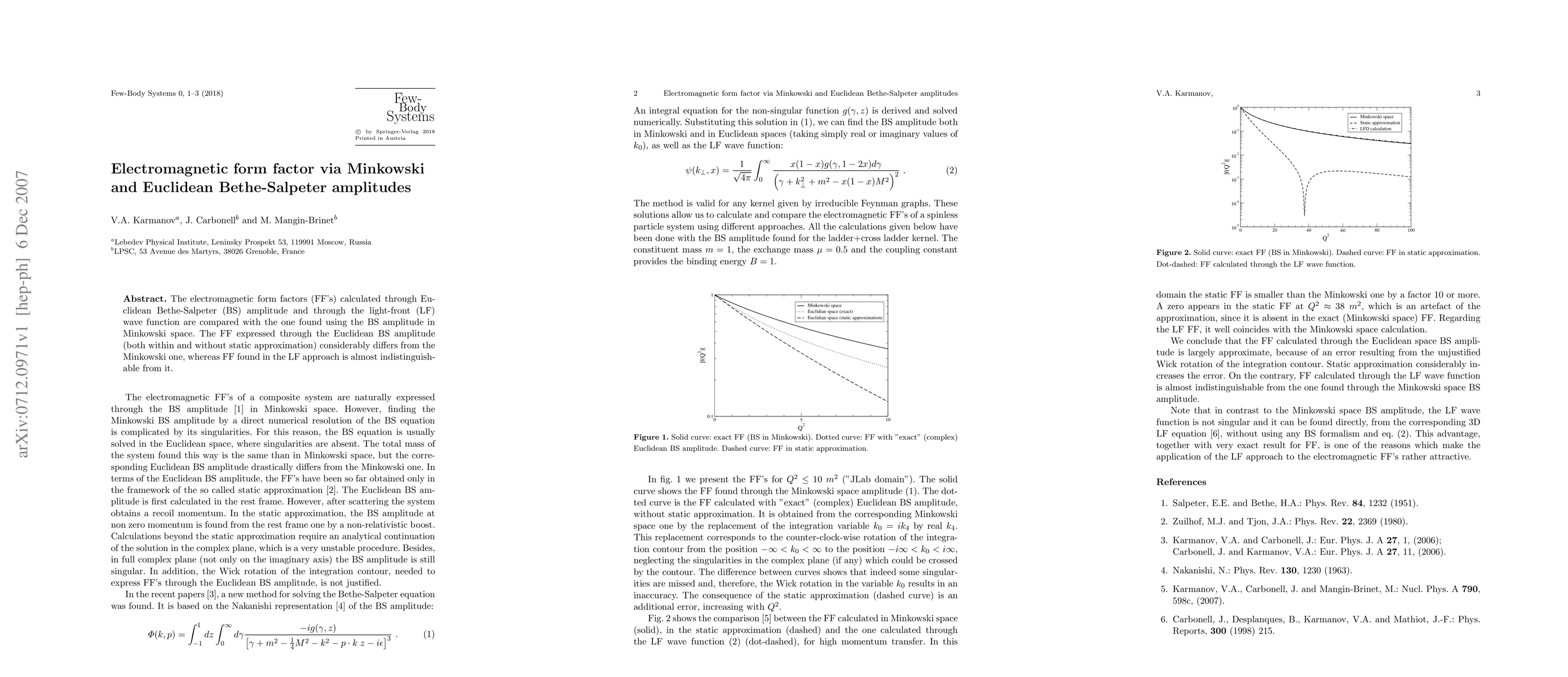 This paper compares electromagnetic form factors derived from Euclidean and Minkowski Bethe-Salpeter amplitudes and light-front wave functions, finding significant differences between the Euclidean and Minkowski results, while the light-front approach closely matches the Minkowski one.