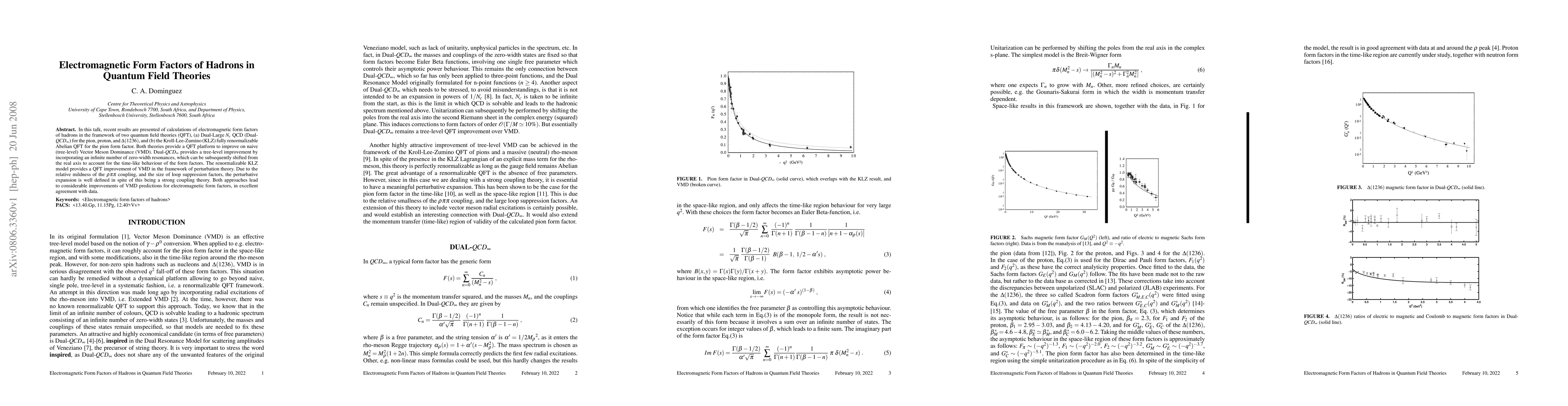 This paper presents calculations of electromagnetic form factors of hadrons using two quantum field theories: Dual-Large $N_c$ QCD for pions, protons, and $\Delta(1236)$, and the Kroll-Lee-Zumino model for pions. Both approaches improve upon Vector Meson Dominance predictions, with Dual-$QCD_\infty$ incorporating an infinite number of resonances and the KLZ model using perturbation theory, leading to excellent agreement with experimental data.