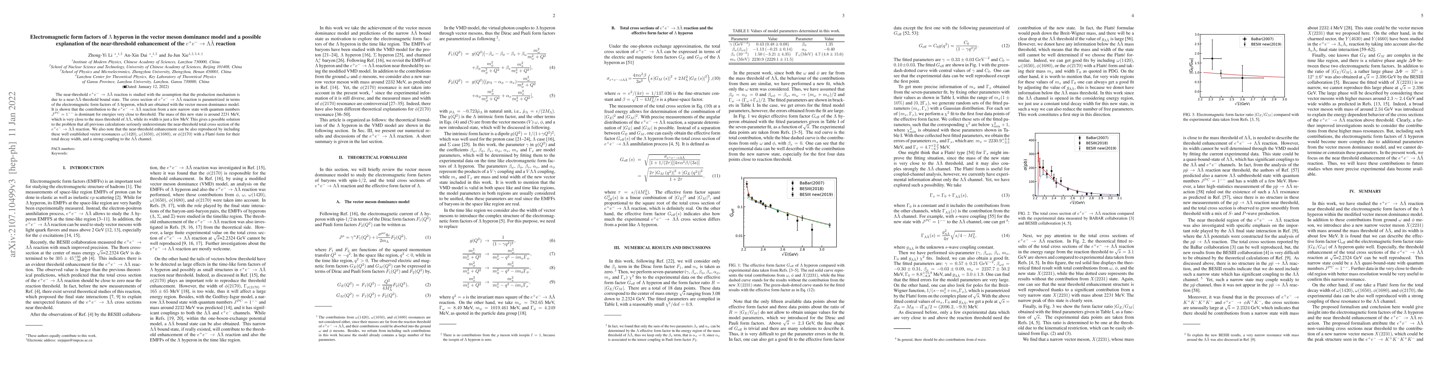 This paper investigates the near-threshold $e^+e^- \to \Lambda\bar{\Lambda}$ reaction using the vector meson dominance model, attributing the observed enhancement to a new narrow state with $J^{PC}=1^{--}$ near the $\Lambda\bar{\Lambda}$ threshold. The study suggests this state, around 2231 MeV, resolves previous underestimations of the reaction's cross section.