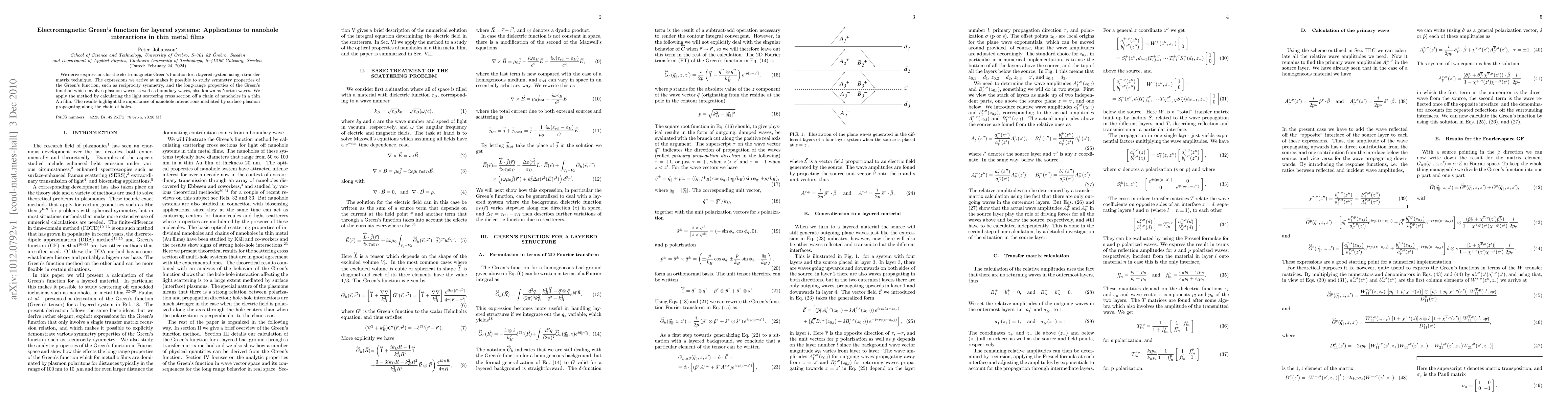 We derive expressions for the electromagnetic Green's function for a layered system using a transfer matrix technique. The expressions we arrive at makes it possible to study symmetry properties of the Green's function, such as reciprocity symmetry, and the long-range properties of the Green's function which involves plasmon waves as well as boundary waves, also known as Norton waves. We apply the method by calculating the light scattering cross section off a chain of nanoholes in a thin Au film. The results highlight the importance of nanohole interactions mediated by surface plasmon propagating along the chain of holes.