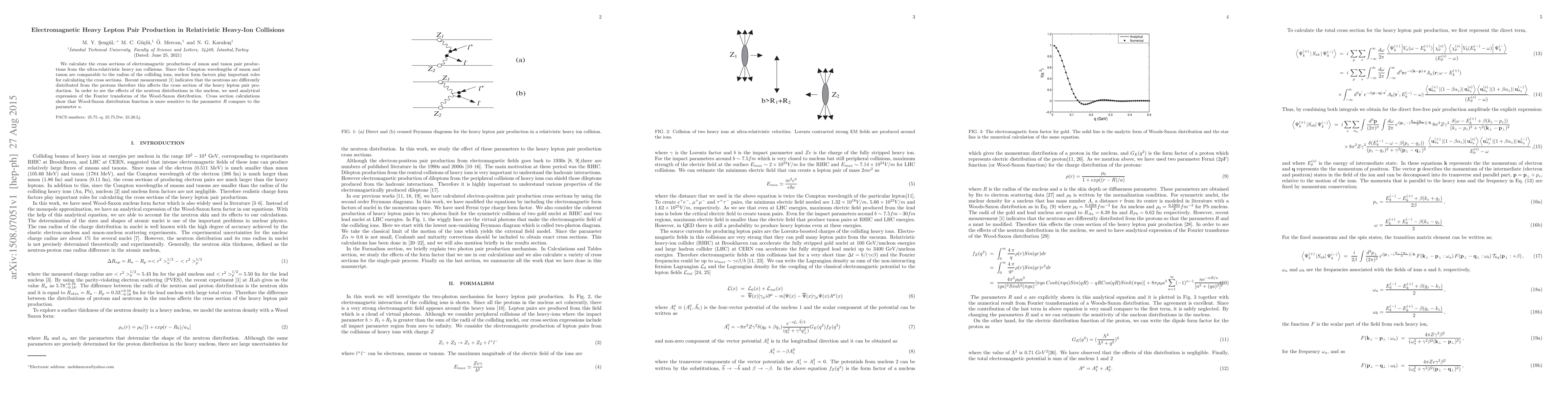 We calculate the cross sections of electromagnetic productions of muon and tauon pair productions from the ultra-relativistic heavy ion collisions. Since the Compton wavelengths of muon and tauon are comparable to the radius of the colliding ions, nuclear form factors play important roles for calculating the cross sections. Recent measurement [1] indicates that the neutrons are differently distributed from the protons therefore this affects the cross section of the heavy lepton pair production. In order to see the effects of the neutron distributions in the nucleus, we used analytical expression of the Fourier transforms of the Wood-Saxon distribution. Cross section calculations show that Wood-Saxon distribution function is more sensitive to the parameter R compare to the parameter a.