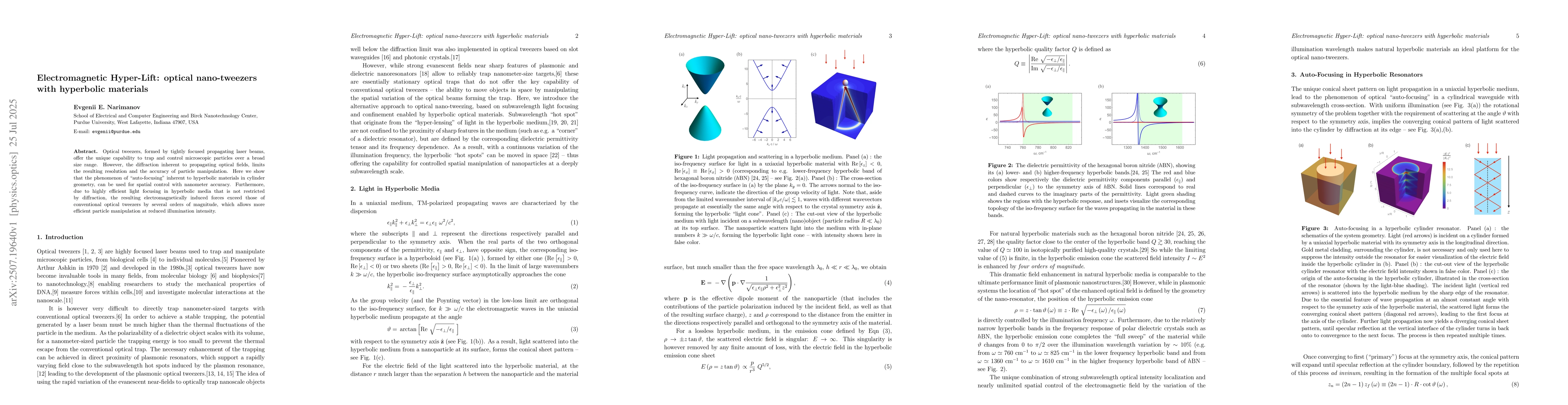Optical tweezers, formed by tightly focused propagating laser beams, offer the unique capability to trap and control microscopic particles over a broad size range. However, the diffraction inherent to propagating optical fields, limits the resulting resolution and the accuracy of particle manipulation. Here we show that the phenomenon of ``auto-focusing'' inherent to hyperbolic materials in cylinder geometry, can be used for spatial control with nanometer accuracy. Furthermore, due to highly efficient light focusing in hyperbolic media that is not restricted by diffraction, the resulting electromagnetically induced forces exceed those of conventional optical tweezers by several orders of magnitude, which allows more efficient particle manipulation at reduced illumination intensity.