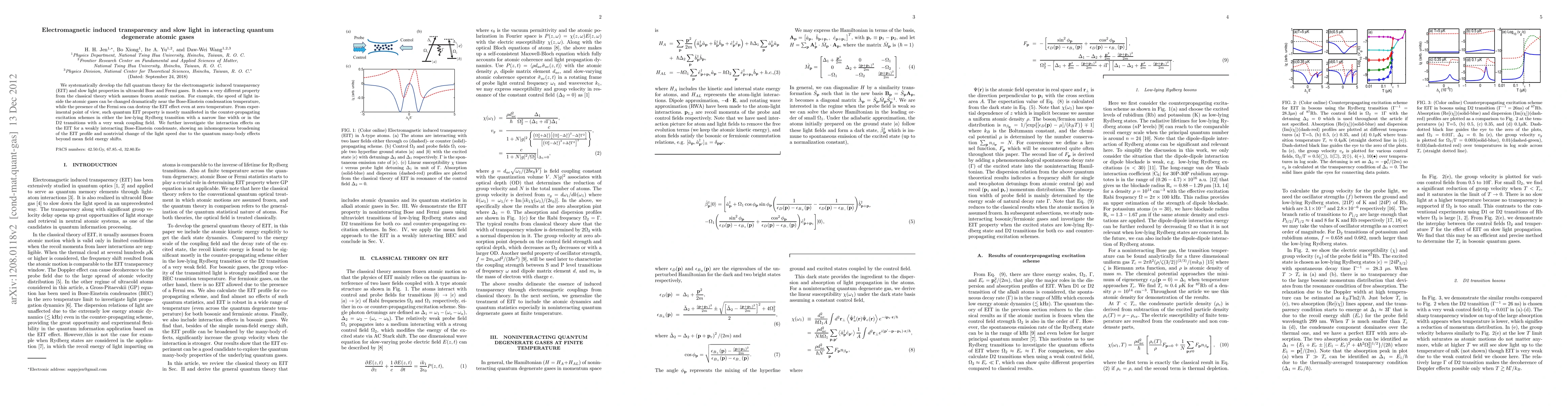 We systematically develop the full quantum theory for the electromagnetic induced transparency (EIT) and slow light properties in ultracold Bose and Fermi gases. It shows a very different property from the classical theory which assumes frozen atomic motion. For example, the speed of light inside the atomic gases can be changed dramatically near the Bose-Einstein condensation temperature, while the presence of the Fermi sea can destroy the EIT effect even at zero temperature. From experimental point of view, such quantum EIT property is mostly manifested in the counter-propagating excitation schemes in either the low-lying Rydberg transition with a narrow line width or in the D2 transitions with a very weak coupling field. We further investigate the interaction effects on the EIT for a weakly interacting Bose-Einstein condensate, showing an inhomogeneous broadening of the EIT profile and nontrivial change of the light speed due to the quantum many-body effects beyond mean field energy shifts.