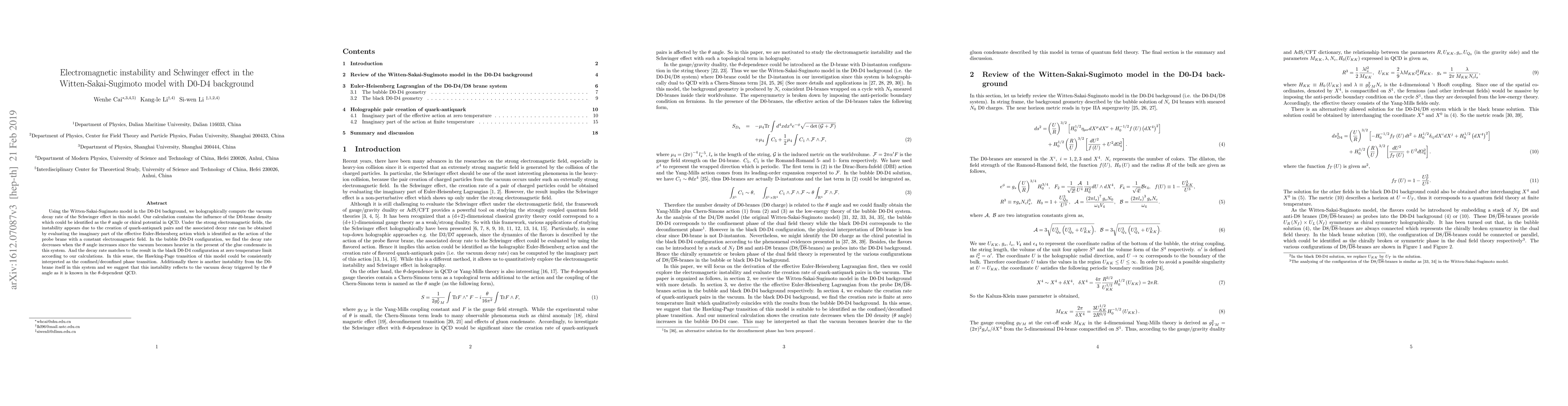 Using the Witten-Sakai-Sugimoto model in the D0-D4 background, we holographically compute the vacuum decay rate of the Schwinger effect in this model. Our calculation contains the influence of the D0-brane density which could be identified as the $\theta$ angle or chiral potential in QCD. Under the strong electromagnetic fields, the instability appears due to the creation of quark-antiquark pairs and the associated decay rate can be obtained by evaluating the imaginary part of the effective Euler-Heisenberg action which is identified as the action of the probe brane with a constant electromagnetic field. In the bubble D0-D4 configuration, we find the decay rate decreases when the $\theta$ angle increases since the vacuum becomes heavier in the present of the glue condensate in this system. And the decay rate matches to the result in the black D0-D4 configuration at zero temperature limit according to our calculations. In this sense, the Hawking-Page transition of this model could be consistently interpreted as the confined/deconfined phase transition. Additionally there is another instability from the D0-brane itself in this system and we suggest that this instability reflects to the vacuum decay triggered by the $\theta$ angle as it is known in the $\theta$-dependent QCD.