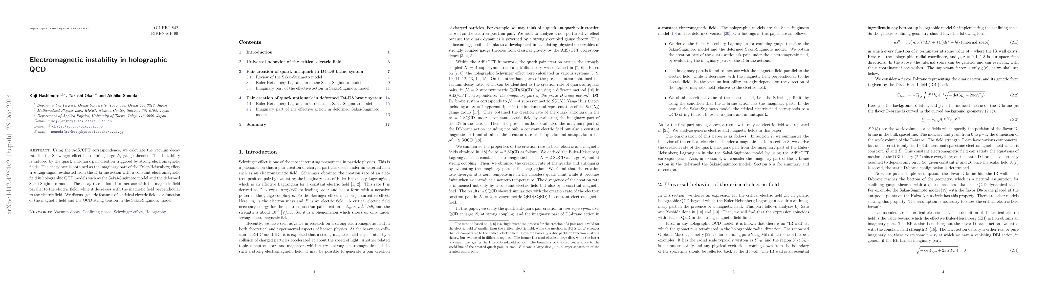 This paper investigates vacuum decay rates in holographic QCD via the Schwinger effect, revealing electromagnetic instability induced by quark-antiquark pair creation under strong fields. The study finds that the decay rate increases with the magnetic field parallel to the electric field and decreases with perpendicular magnetic fields, discussing critical electric field behavior and QCD string tension in the Sakai-Sugimoto model.