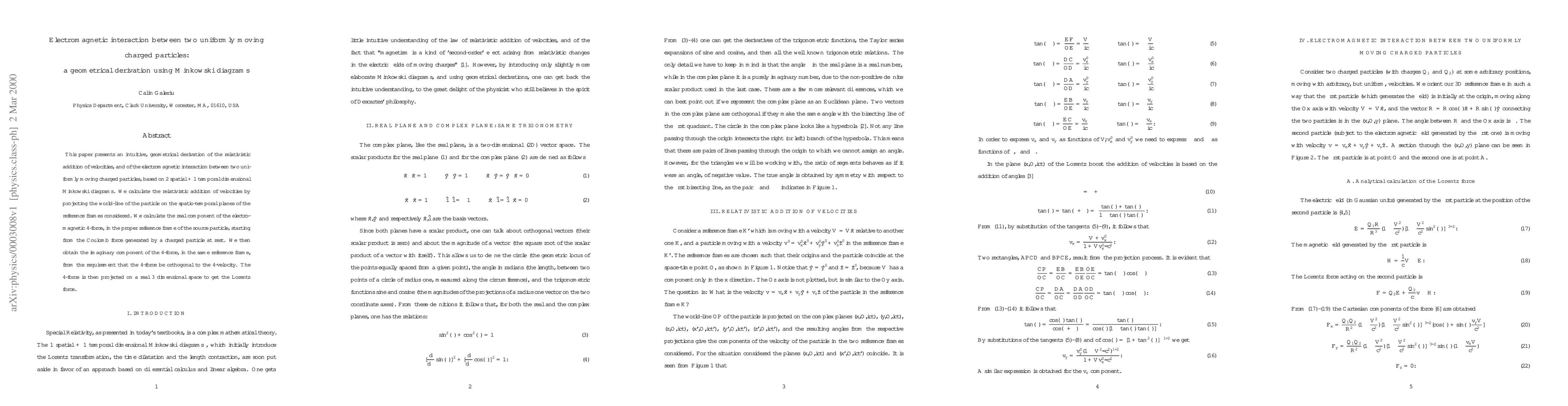 This paper presents an intuitive, geometrical derivation of the relativistic addition of velocities, and of the electromagnetic interaction between two uniformly moving charged particles, based on 2 spatial + 1 temporal dimensional Minkowski diagrams. We calculate the relativistic addition of velocities by projecting the world-line of the particle on the spatio-temporal planes of the reference frames considered. We calculate the real component of the electro- magnetic 4-force, in the proper reference frame of the source particle, starting from the Coulomb force generated by a charged particle at rest. We then obtain the imaginary component of the 4-force, in the same reference frame, from the requirement that the 4-force be orthogonal to the 4-velocity. The 4-force is then projected on a real 3 dimensional space to get the Lorentz force.