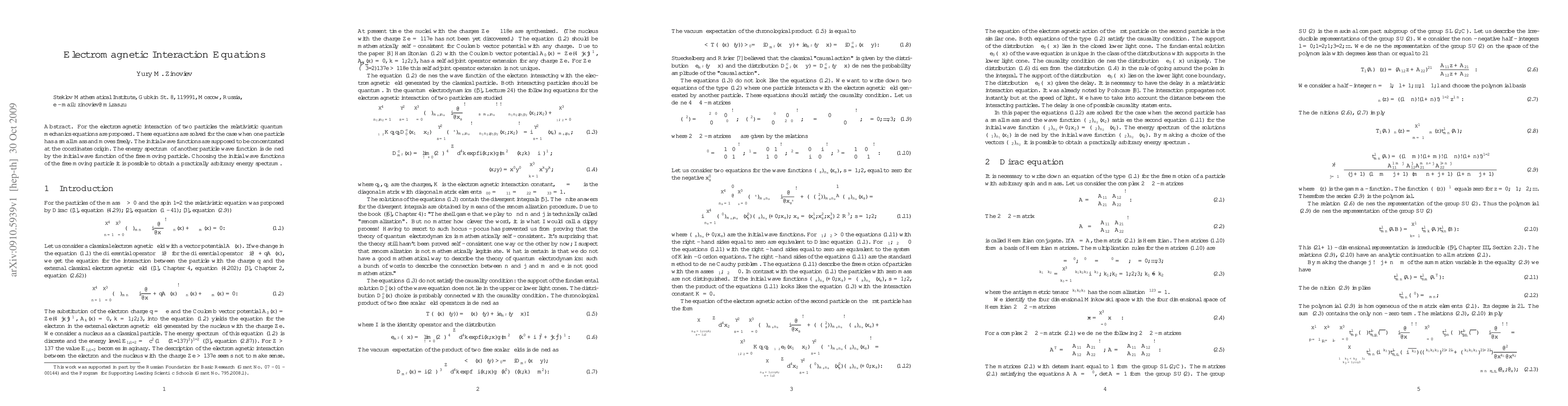 For the electromagnetic interaction of two particles the relativistic quantum mechanics equations are proposed. These equations are solved for the case when one particle has a small mass and moves freely. The initial wave functions are supposed to be concentrated at the coordinates origin. The energy spectrum of another particle wave function is defined by the initial wave function of the free moving particle. Choosing the initial wave function of the free moving particle it is possible to obtain a practically arbitrary energy spectrum.