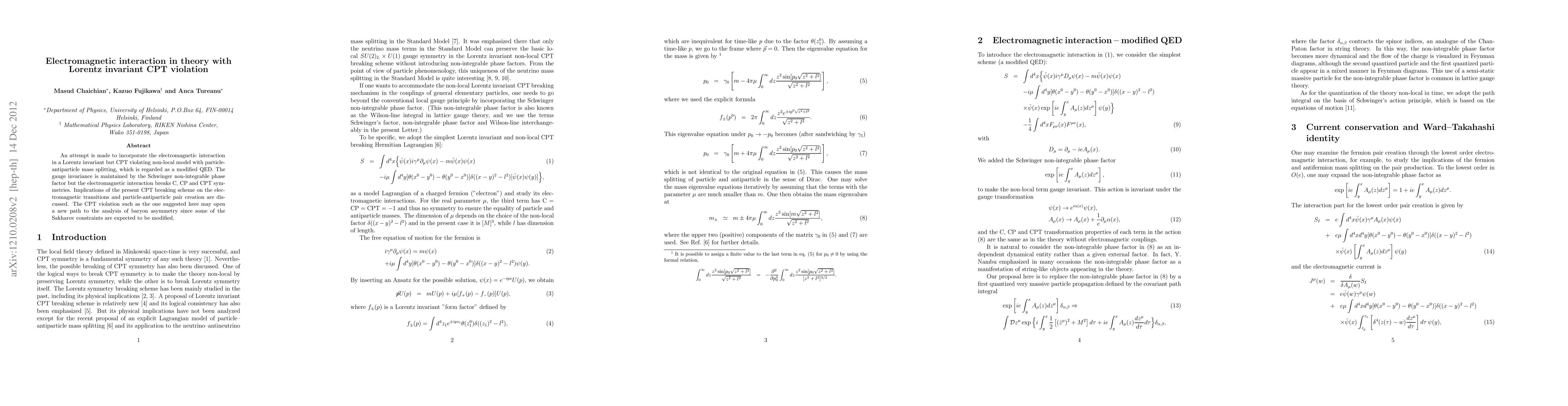 This paper proposes a modified quantum electrodynamics model that preserves Lorentz invariance but violates CPT symmetry through non-local interactions, leading to particle-antiparticle mass differences. The study discusses implications for electromagnetic transitions and particle-antiparticle pair creation, potentially offering insights into baryon asymmetry.