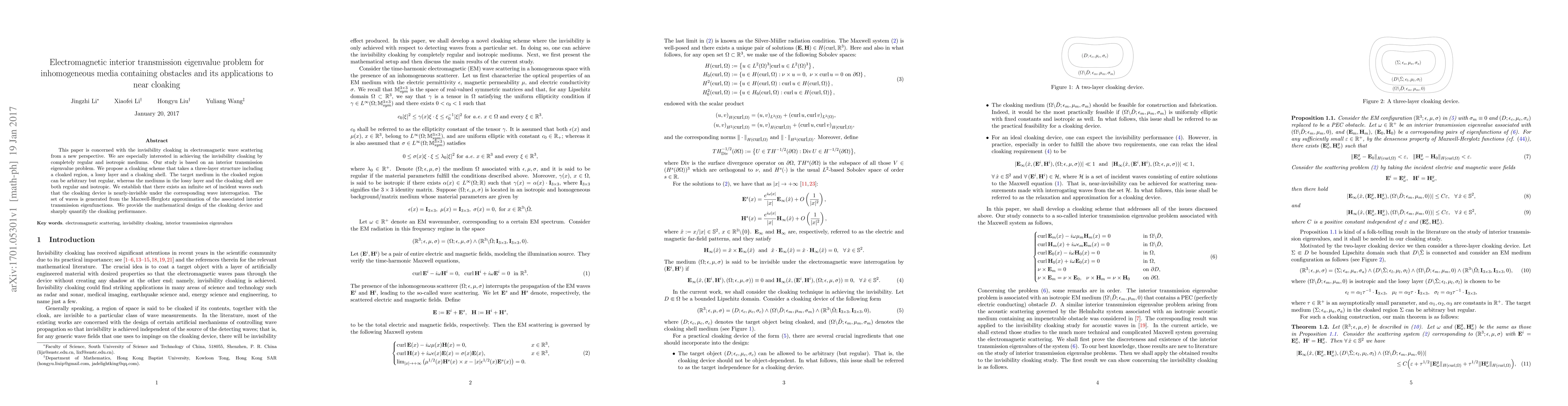 This paper proposes a novel electromagnetic cloaking scheme using a three-layer structure based on an interior transmission eigenvalue problem, achieving near invisibility for arbitrary but regular target mediums within a lossy layer and isotropic cloaking shell. The cloaking performance is mathematically designed and quantified.