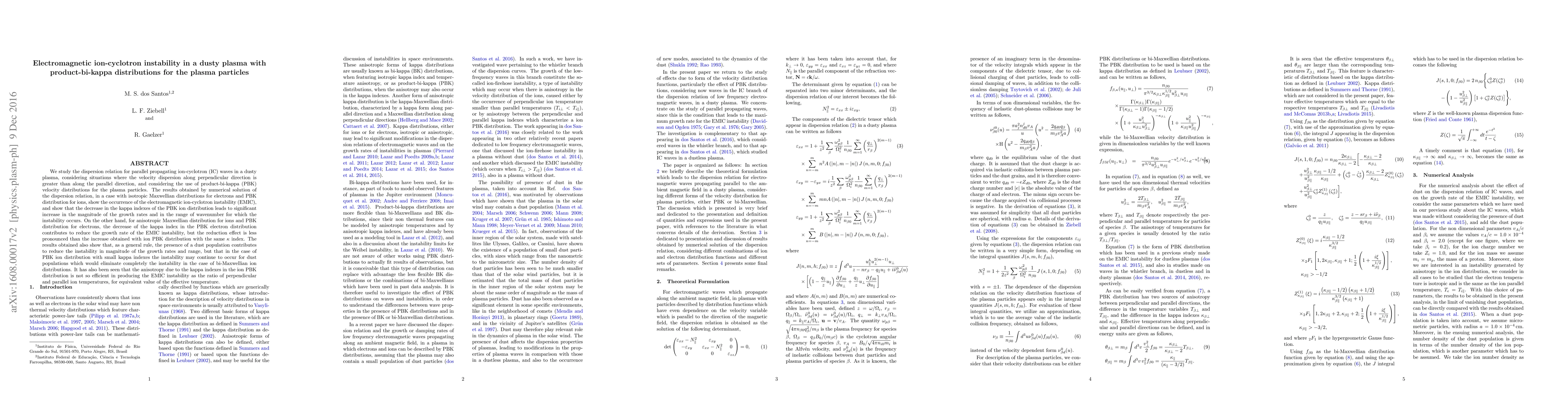 We study the dispersion relation for parallel propagating ion-cyclotron (IC) waves in a dusty plasma, considering situations where the velocity dispersion along perpendicular direction is greater than along the parallel direction, and considering the use of product-bi-kappa (PBK) velocity distributions for the plasma particles. The results obtained by numerical solution of the dispersion relation, in a case with isotropic Maxwellian distributions for electrons and PBK distribution for ions, show the occurrence of the electromagnetic ion-cyclotron instability (EMIC), and show that the decrease in the kappa indexes of the PBK ion distribution leads to significant increase in the magnitude of the growth rates and in the range of wavenumber for which the instability occurs. On the other hand, for anisotropic Maxwellian distribution for ions and PBK distribution for electrons, the decrease of the kappa index in the PBK electron distribution contributes to reduce the growth rate of the EMIC instability, but the reduction effect is less pronounced than the increase obtained with ion PBK distribution with the same $\kappa$ index. The results obtained also show that, as a general rule, the presence of a dust population contributes to reduce the instability in magnitude of the growth rates and range, but that in the case of PBK ion distribution with small kappa indexes the instability may continue to occur for dust populations which would eliminate completely the instability in the case of bi-Maxwellian ion distributions. It has also been seen that the anisotropy due to the kappa indexes in the ion PBK distribution is not so efficient in producing the EMIC instability as the ratio of perpendicular and parallel ion temperatures, for equivalent value of the effective temperature.
