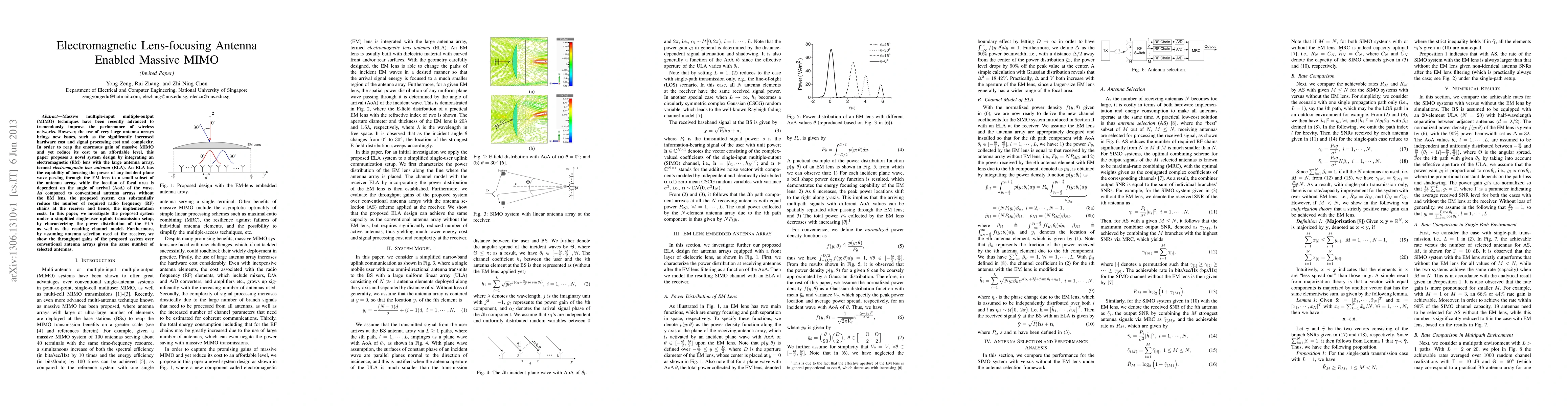 This paper proposes a novel electromagnetic lens antenna (ELA) system to enhance massive MIMO performance while reducing costs. The ELA focuses incident plane waves to a subset of the antenna array, lowering the number of required RF chains and thus implementation costs. The study demonstrates throughput gains over conventional arrays under a single-user uplink setup.