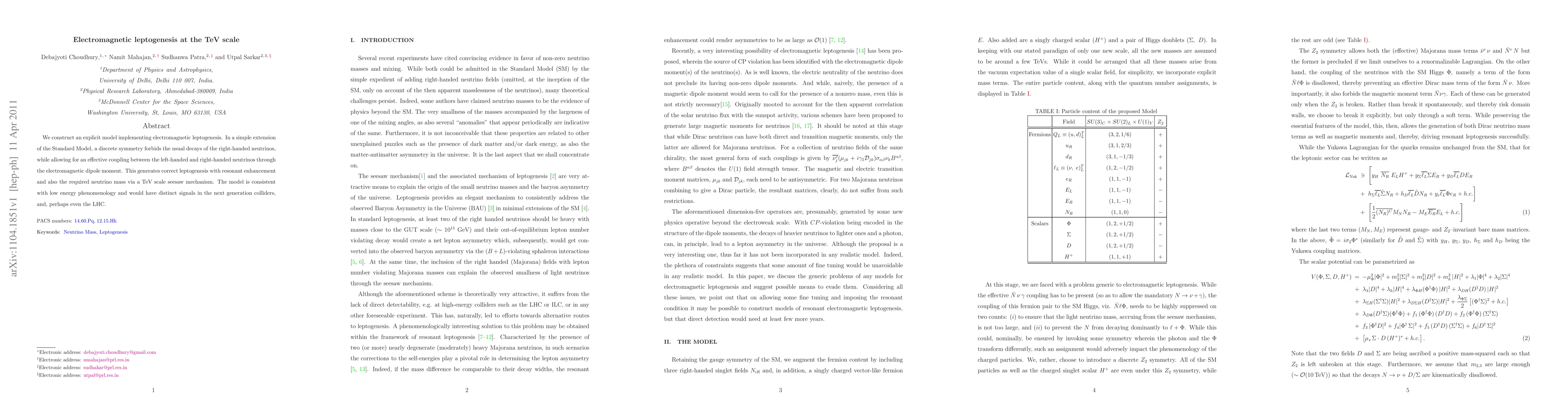 This paper proposes a model extending the Standard Model to implement electromagnetic leptogenesis at the TeV scale, utilizing a discrete symmetry to enable effective neutrino coupling and generate resonant leptogenesis and neutrino mass via a seesaw mechanism. The model is consistent with low-energy observations and may be detectable at future colliders like the LHC.