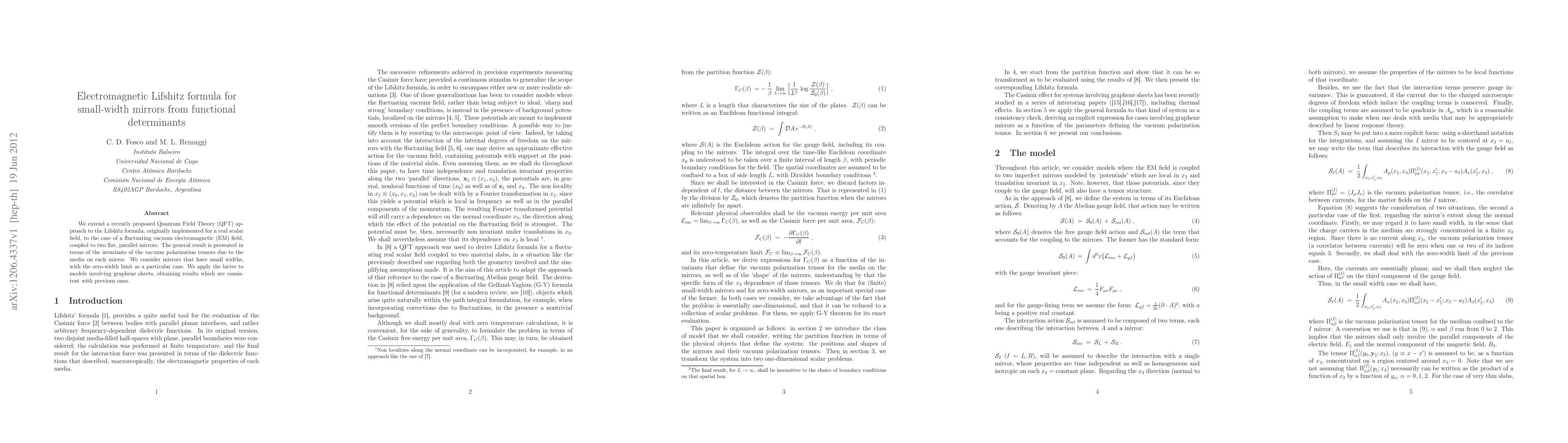 We extend a recently proposed Quantum Field Theory (QFT) approach to the Lifshitz formula, originally implemented for a real scalar field, to the case of a fluctuating vacuum electromagnetic (EM) field, coupled to two flat, parallel mirrors. The general result is presented in terms of the invariants of the vacuum polarization tensors due to the media on each mirror. We consider mirrors that have small widths, with the zero-width limit as a particular case. We apply the latter to models involving graphene sheets, obtaining results which are consistent with previous ones.