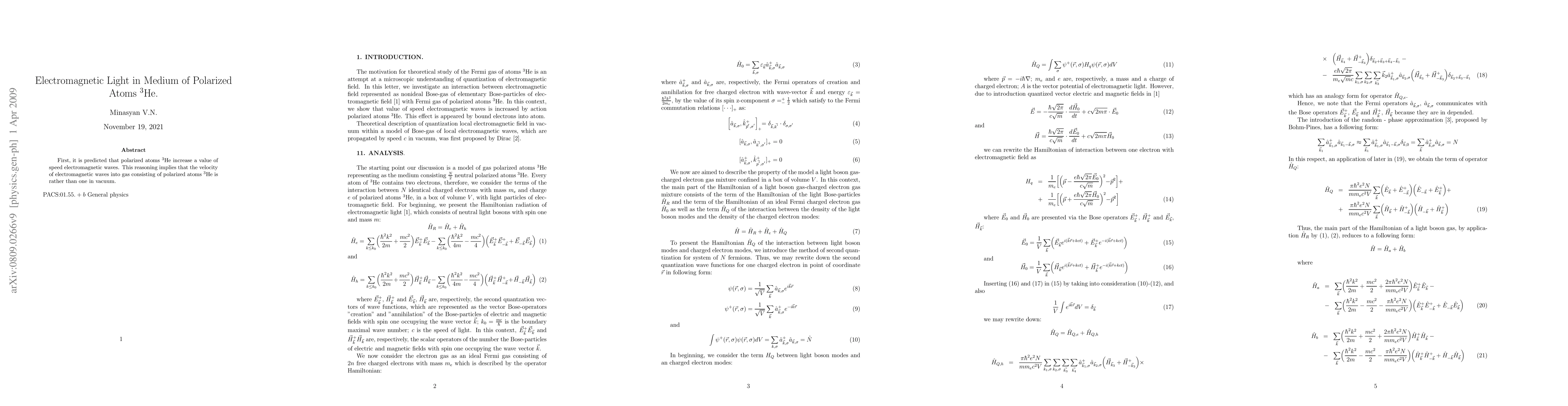 First, it is predicted that polarized atoms $^3$He increase a value of speed electromagnetic waves. This reasoning implies that the velocity of electromagnetic waves into gas consisting of polarized atoms $^3$He is rather than one in vacuum.