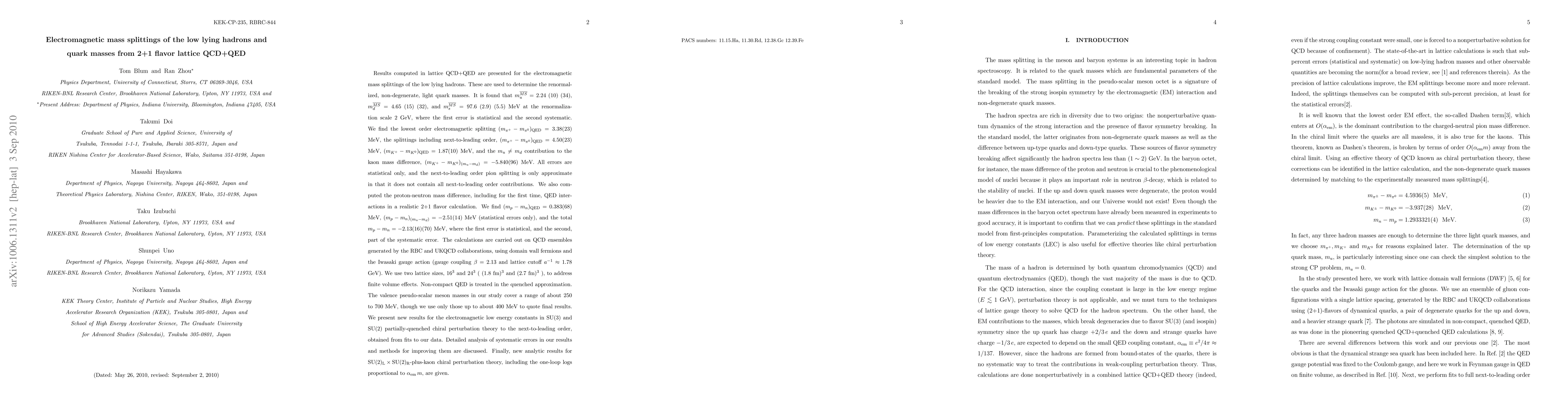 Researchers used a combination of lattice QCD and QED to determine light quark masses, finding values for u, d, and s quarks with small uncertainties, and also explored electromagnetic mass splittings of low-lying hadrons.