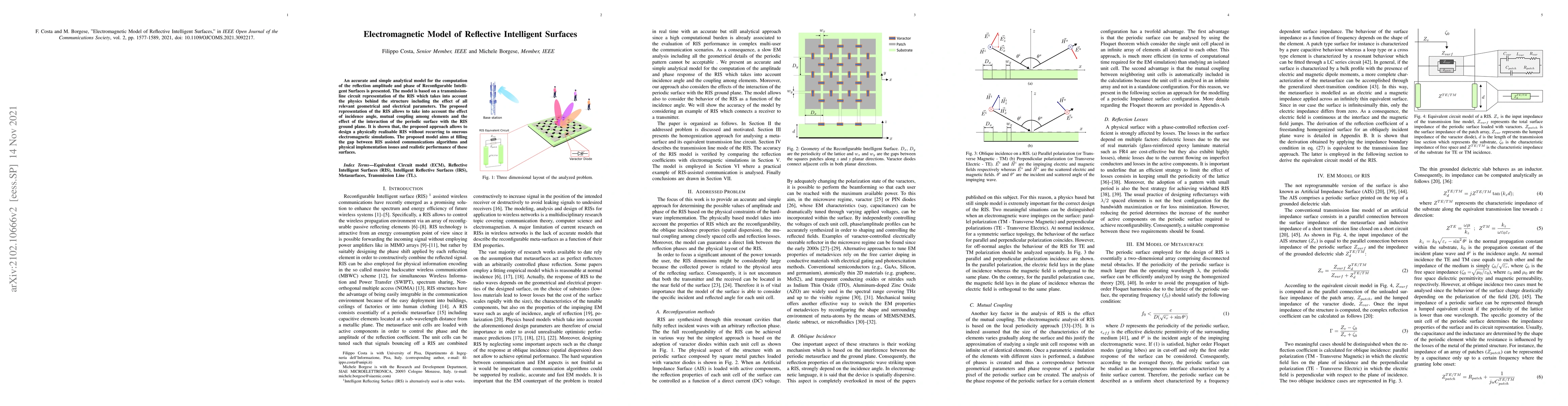 An accurate and simple analytical model for the computation of the reflection amplitude and phase of Reconfigurable Intelligent Surfaces is presented. The model is based on a transmission-line circuit representation of the RIS which takes into account the physics behind the structure including the effect of all relevant geometrical and electrical parameters. The proposed representation of the RIS allows to take into account the effect of incidence angle, mutual coupling among elements and the effect of the interaction of the periodic surface with the RIS ground plane. It is shown that the proposed approach allows to design a physically realisable RIS without recurring to onerous electromagnetic simulations. The proposed model aims at filling the gap between RIS assisted communications algorithms and physical implementation issues which determine realistic performance of these surfaces.